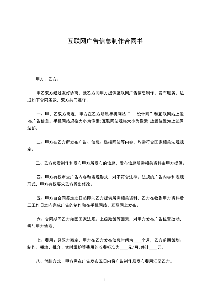 甲乙双方经过友好协商,就乙方向甲方提供互联网广告信息制作、发布服务,达成如下合同条款,双方共同遵守:
