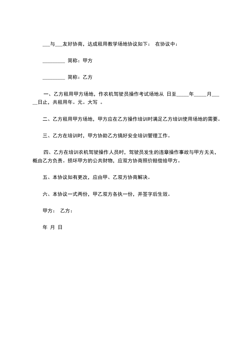 一、乙方租用甲方场地,作农机驾驶员操作考试场地从 日至_____年_____月_____日止,共租用年。元。大写 。