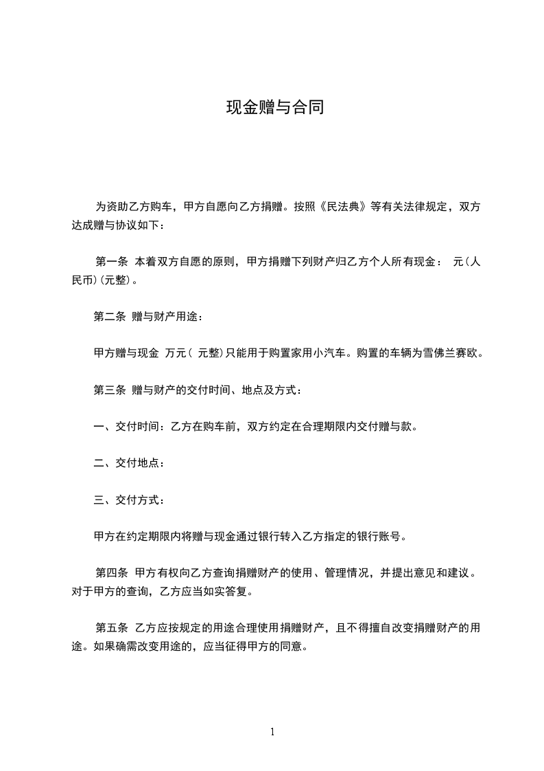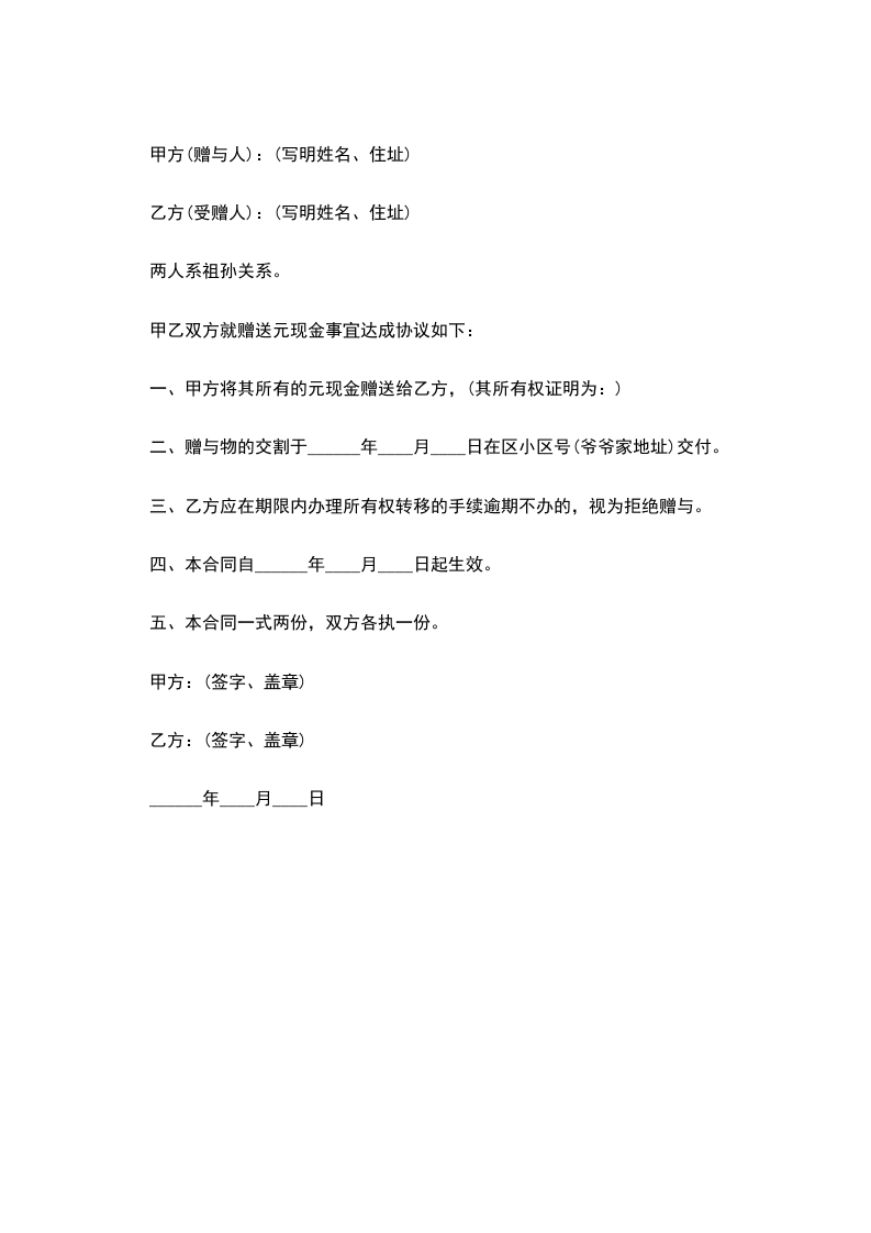一、甲方将其所有的元现金赠送给乙方,(其所有权证明为:)