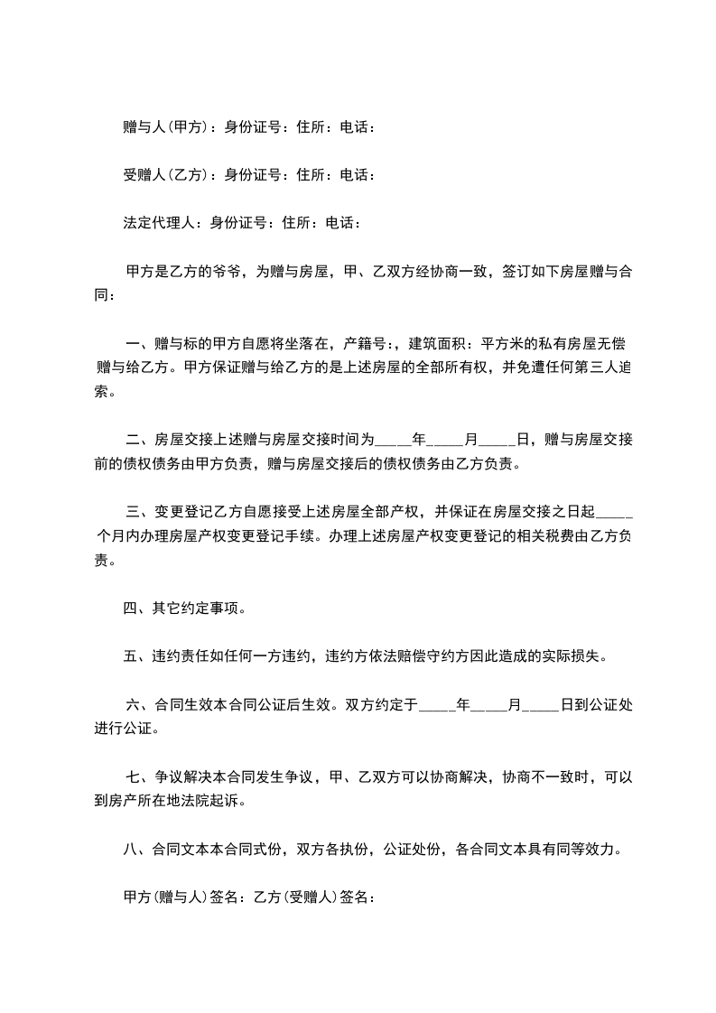 二、赠与物的交割于______年____月____日在区小区号(爷爷家地址)交付。