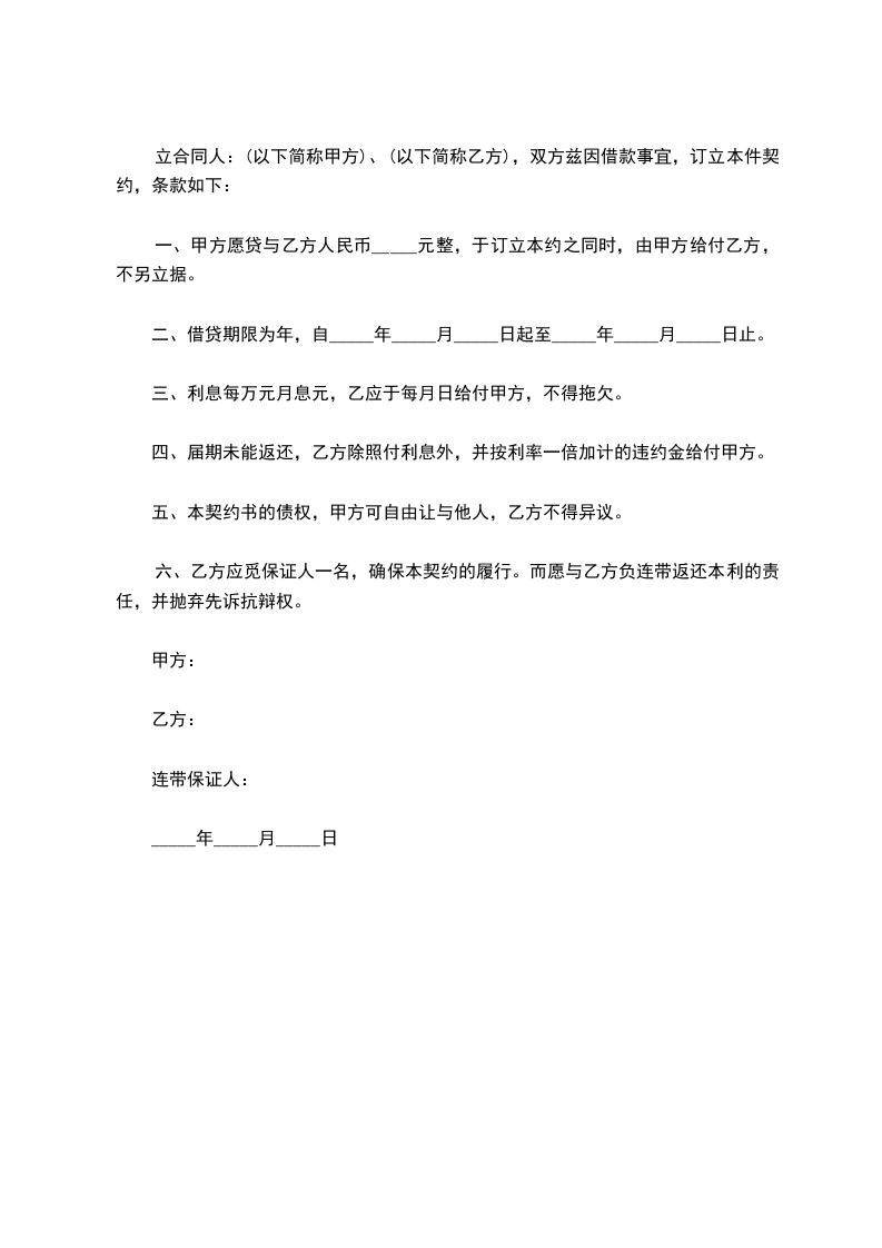 一、甲方愿贷与乙方人民币_____元整,于订立本约之同时,由甲方给付乙方,不另立据。