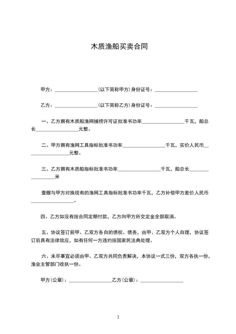 一、甲方自愿将渔船卖于乙方,并保证提交给乙方的渔船真实,船用设备正常及证书(包括渔业捕捞许可证、国籍证书、所有权证书、检验证书等)真实齐全有效。
