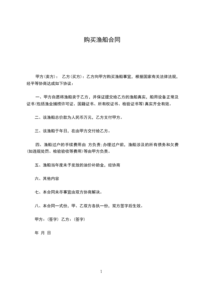 甲方(卖方): 乙方(买方):乙方向甲方购买渔船事宜,根据国家有关法律法规,经平等协商达成如下协议: