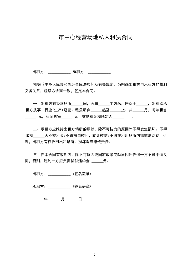 一、出租方有经营场所______间,面积______平方米,座落于______,出租给承租方从事 行业(生产)经营。租赁期自______起至______止。共______月,每年租金______ 元,租金总额______ 元,交纳租金期限定为______: 。