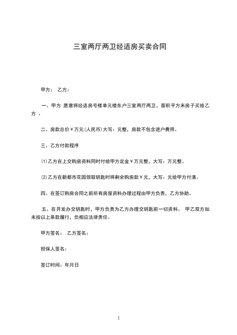 一、甲方 愿意将经适房号楼单元楼东户三室两厅两卫,面积平方米房子买给乙方 。