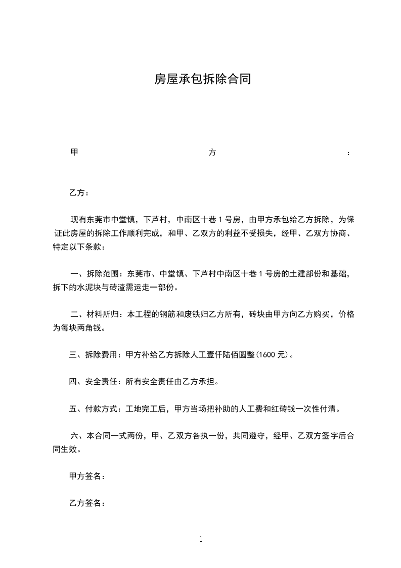 现有东莞市中堂镇,下芦村,中南区十巷1号房,由甲方承包给乙方拆除,为保证此房屋的拆除工作顺利完成,和甲、乙双方的利益不受损失,经甲、乙双方协商、特定以下条款: