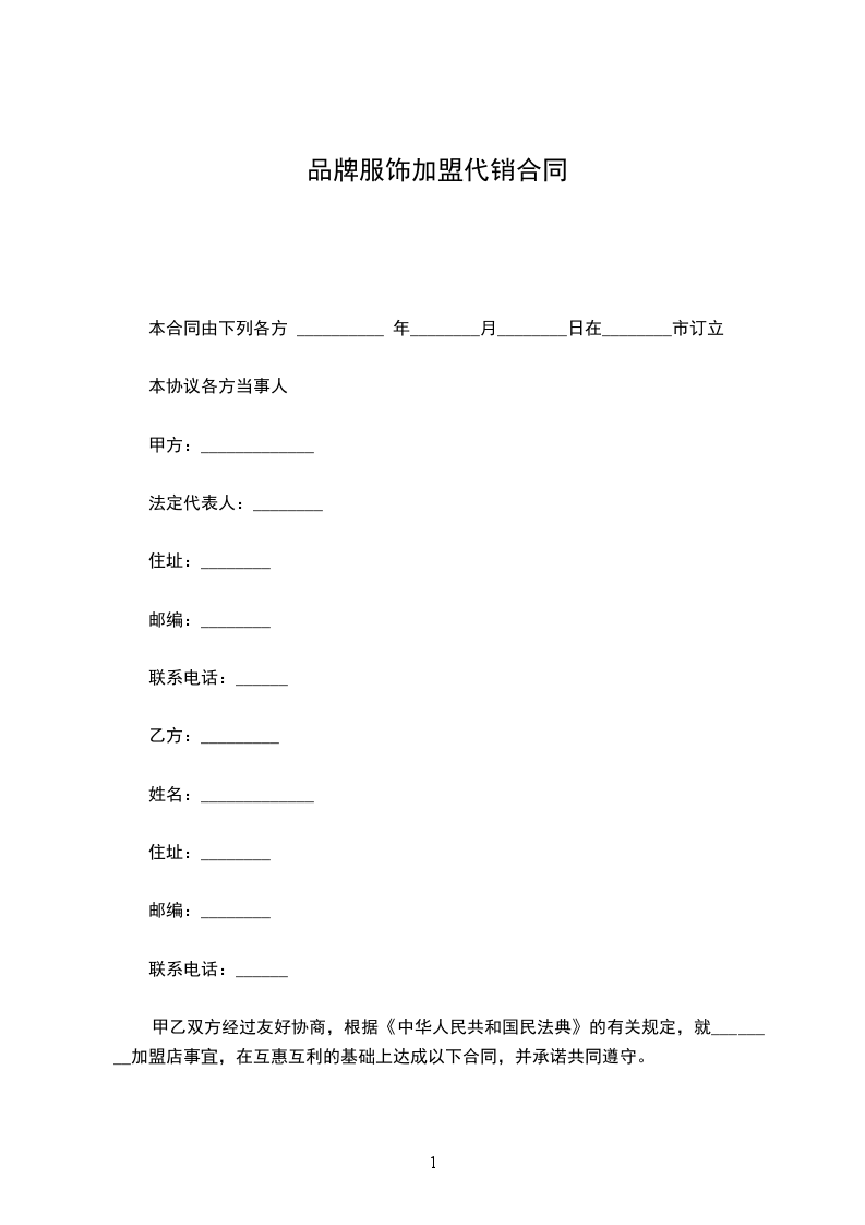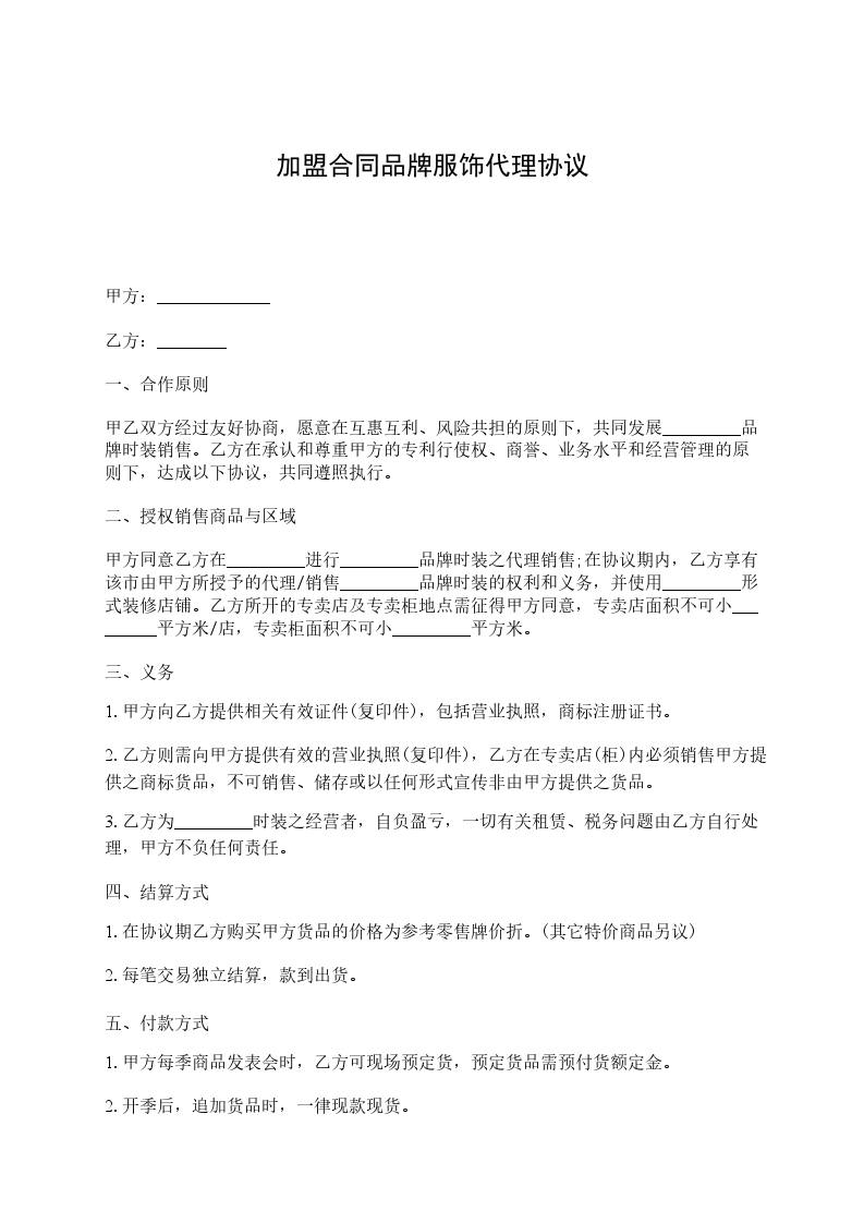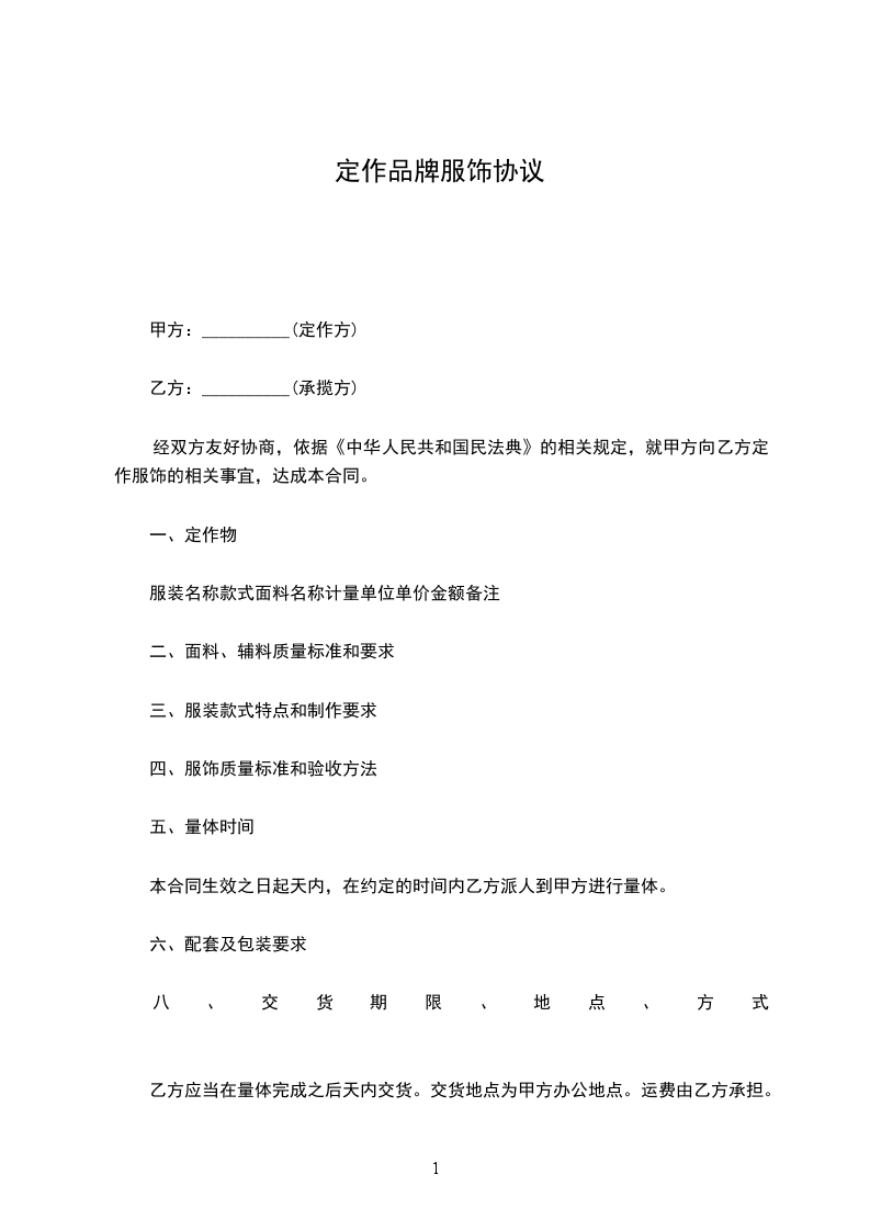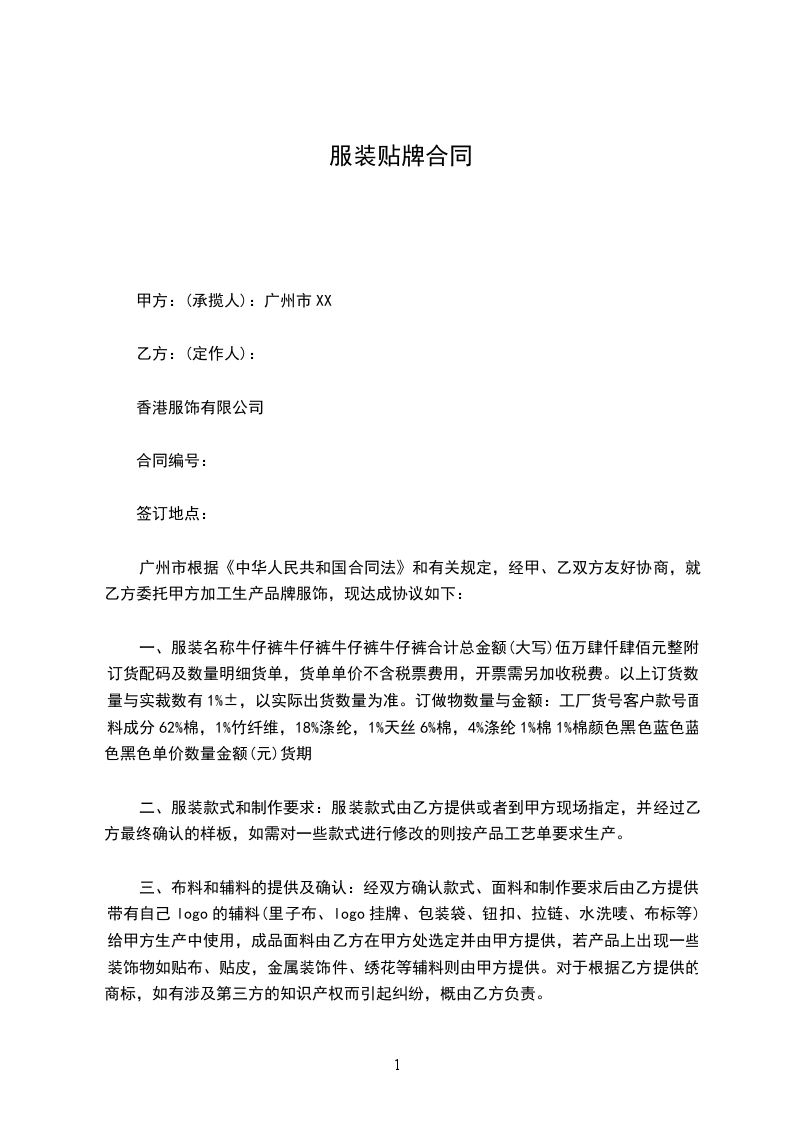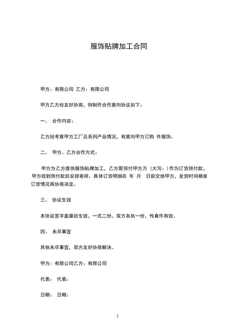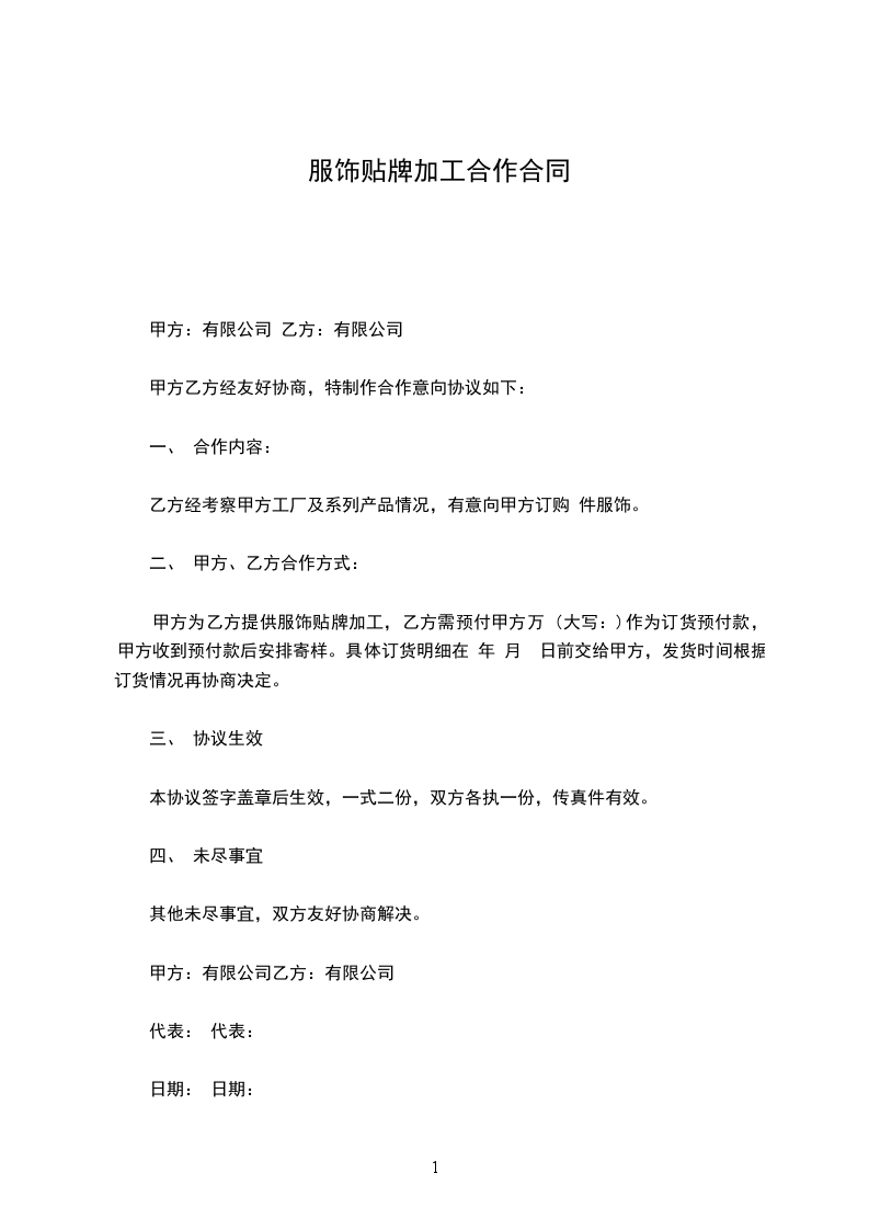 甲方为乙方提供服饰贴牌加工,乙方需预付甲方万 (大写:)作为订货预付款,甲方收到预付款后安排寄样。具体订货明细在 年 月 日前交给甲方,发货时间根据订货情况再协商决定。