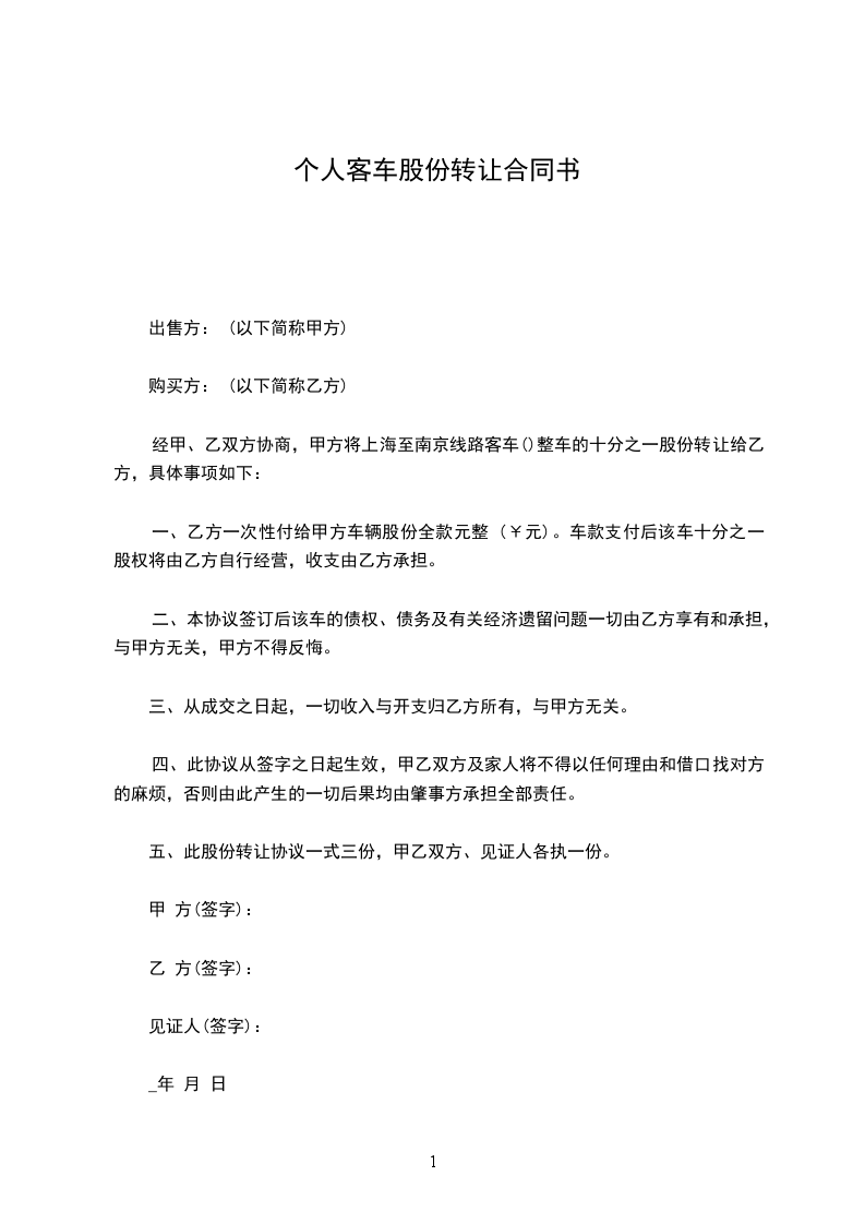 经甲、乙双方协商,甲方将上海至南京线路客车()整车的十分之一股份转让给乙方,具体事项如下: