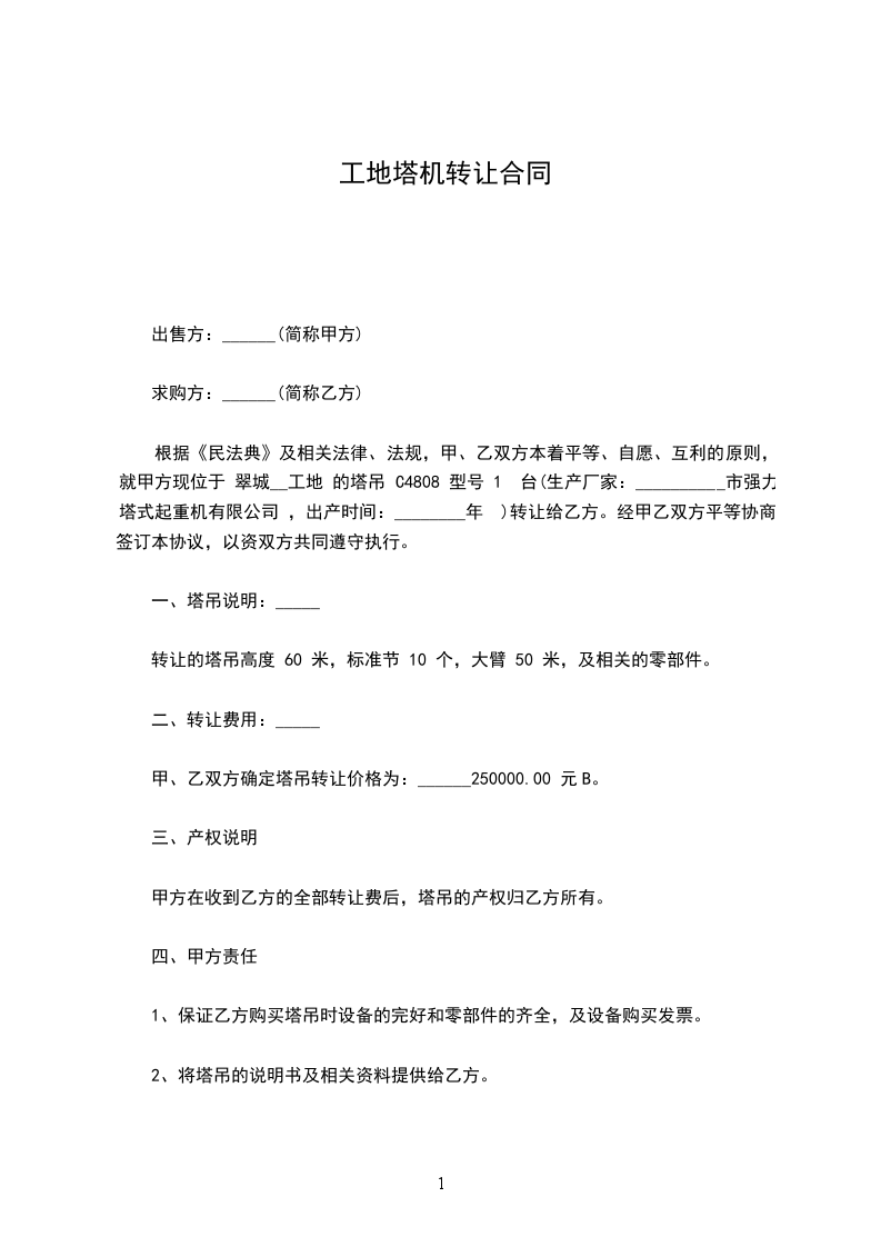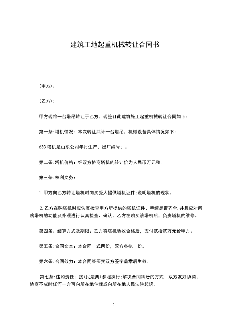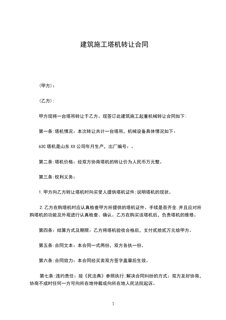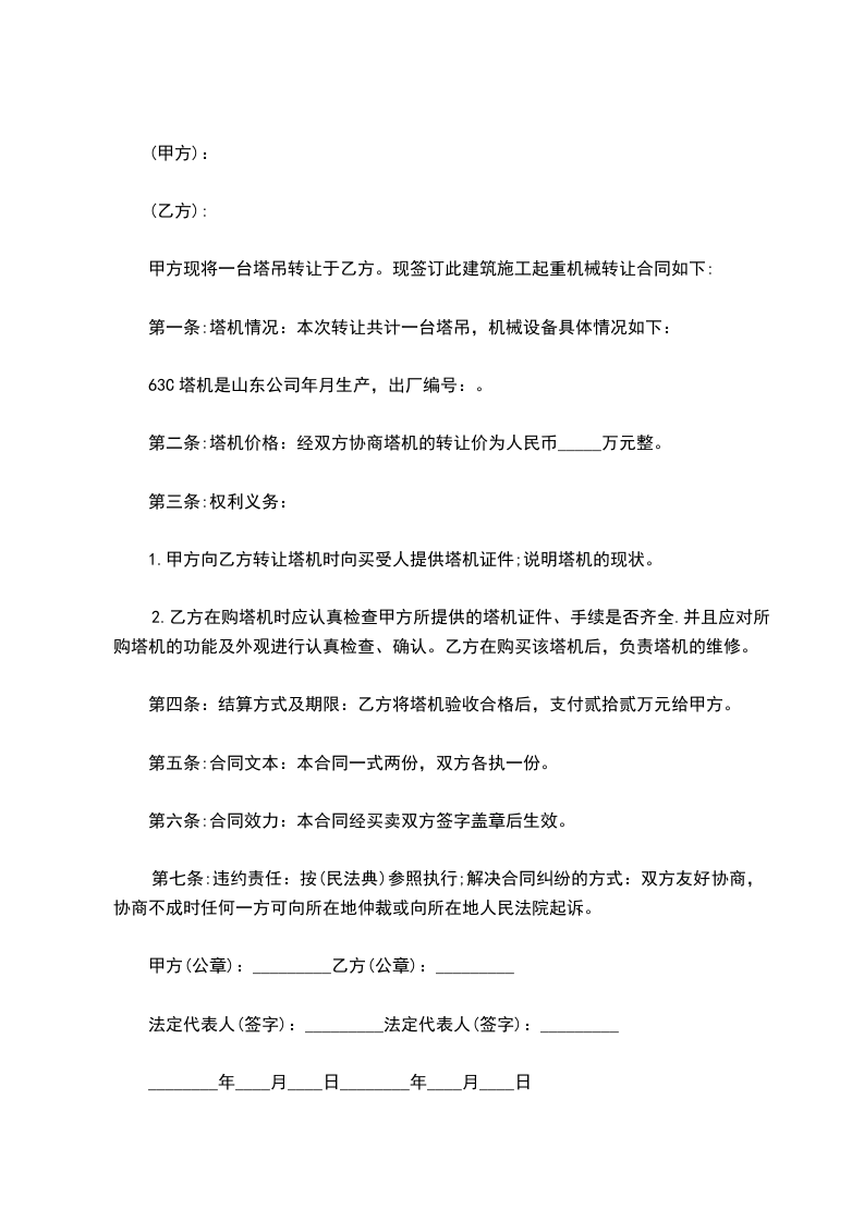 五、此合同一式二份,甲乙双方各执一份,签字生效。 补充:该塔机现值人民币____万元,如有严重损坏或遗失,则由乙方按该塔机现值人民币___万元赔偿给甲方。