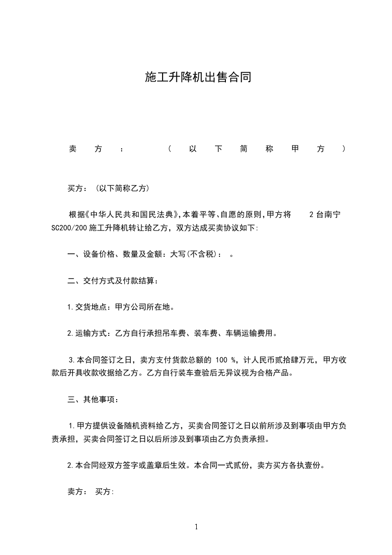 根据《中华人民共和国民法典》,本着平等、自愿的原则,甲方将2台南宁SC200/200施工升降机转让给乙方,双方达成买卖协议如下: