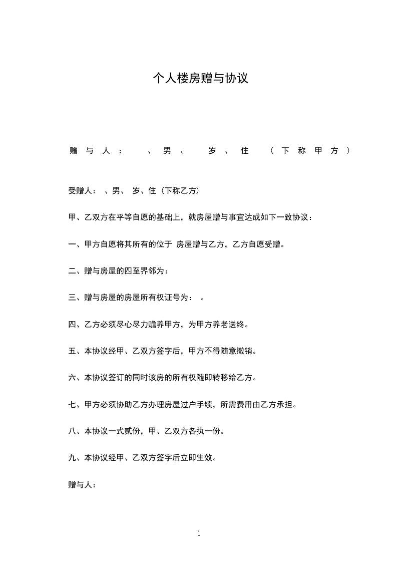 赠与人: 、男、 岁、住 (下称甲方)