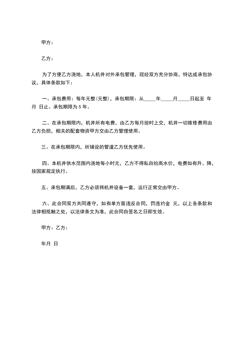 为了方便乙方浇地,本人机井对外承包管理,现经双方充分协商,特达成承包协议,具体条款如下: