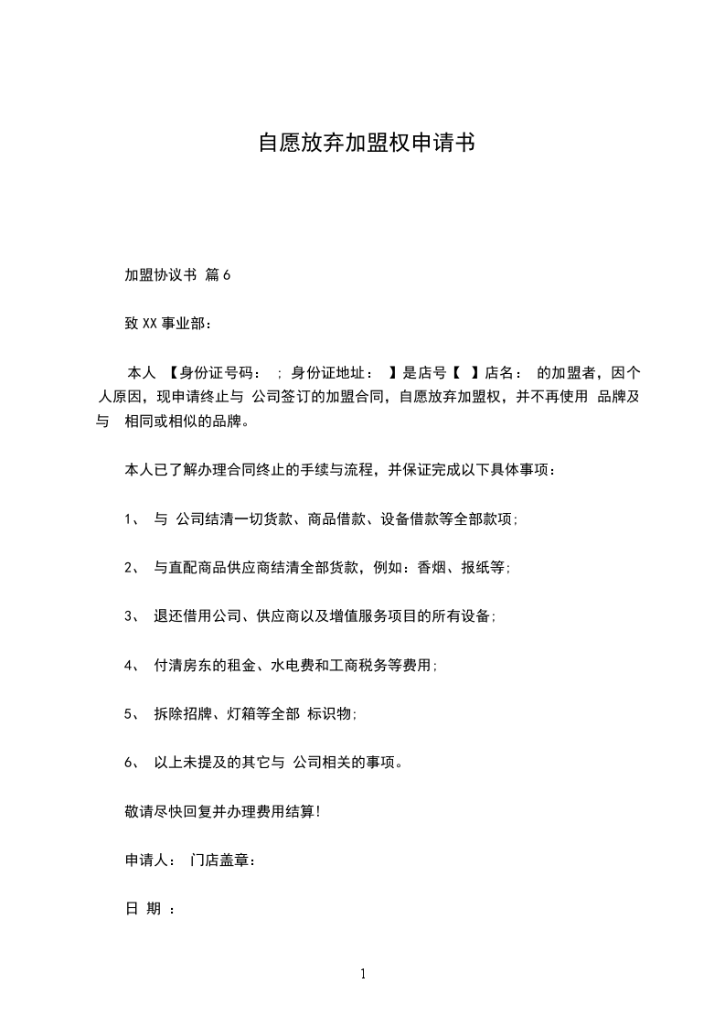 本人 【身份证号码: ; 身份证地址: 】是店号【 】店名: 的加盟者,因个人原因,现申请终止与 公司签订的加盟合同,自愿放弃加盟权,并不再使用 品牌及与 相同或相似的品牌。