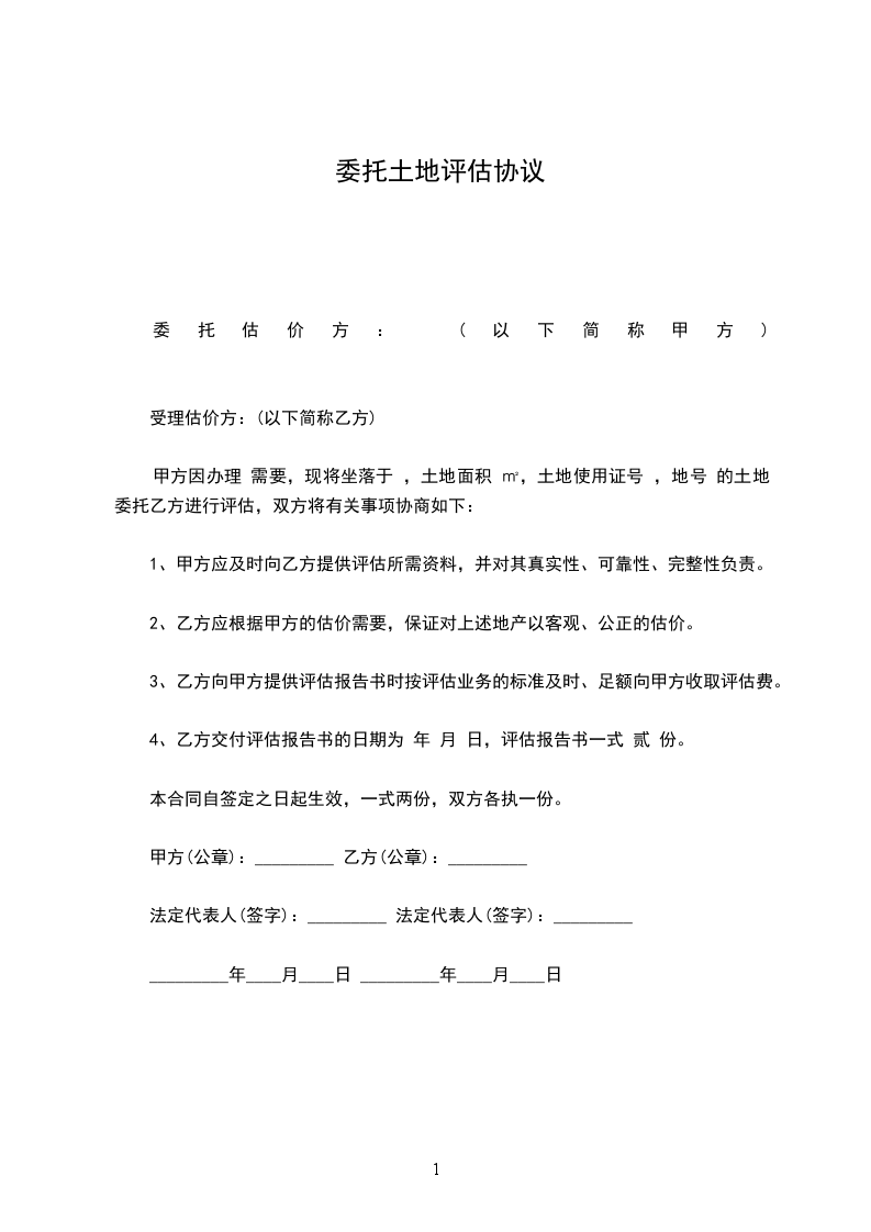 甲方因办理 需要,现将坐落于 ,土地面积 ㎡,土地使用证号 ,地号 的土地委托乙方进行评估,双方将有关事项协商如下:
