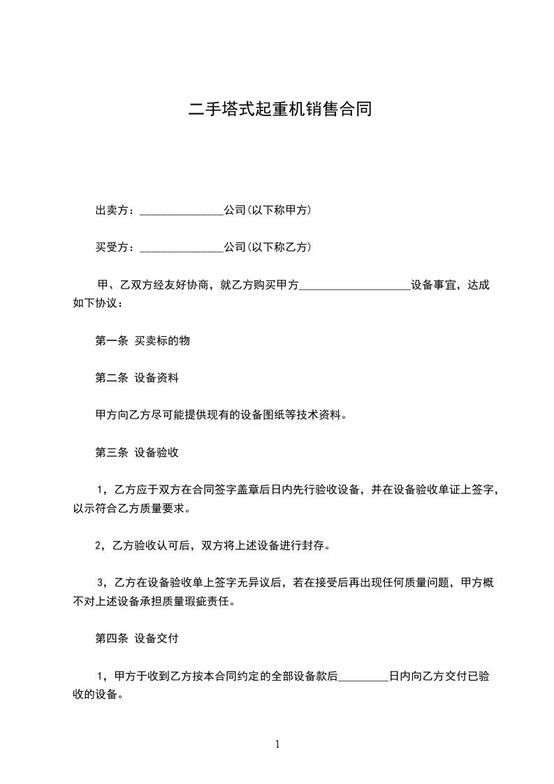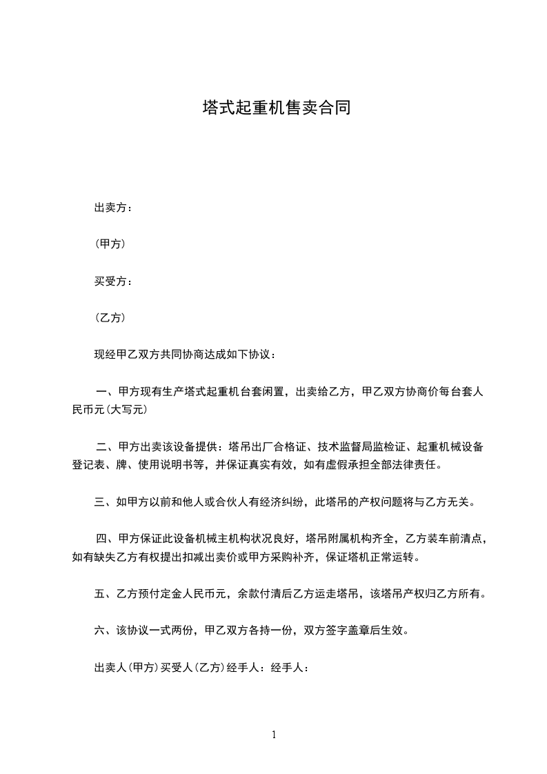 一、甲方现有生产塔式起重机台套闲置,出卖给乙方,甲乙双方协商价每台套人民币_____元(大写元)