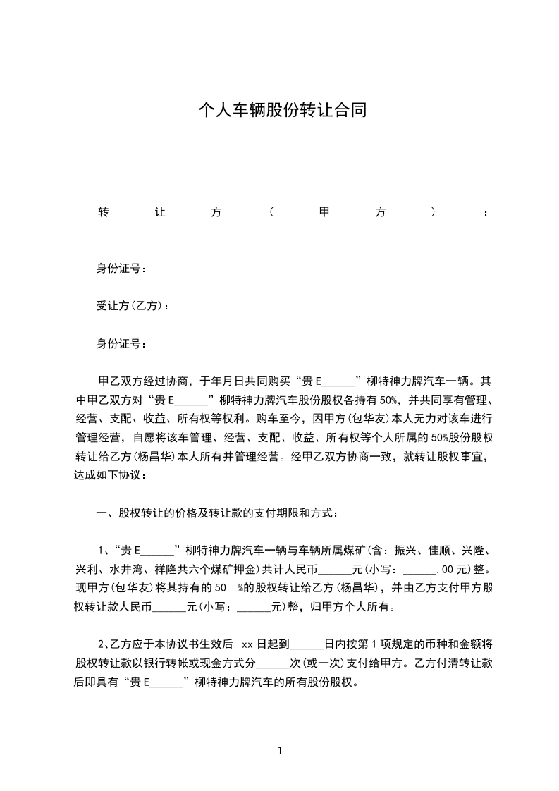 一、乙方一次性付给甲方车辆股份全款元整 (¥元)。车款支付后该车十分之一股权将由乙方自行经营,收支由乙方承担。