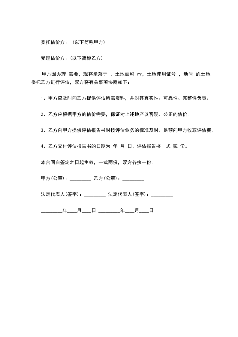 4、乙方交付评估报告书的日期为 年 月 日,评估报告书一式 贰 份。