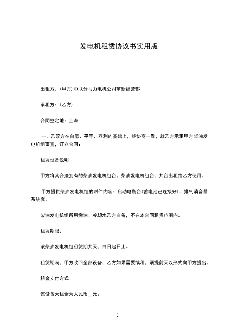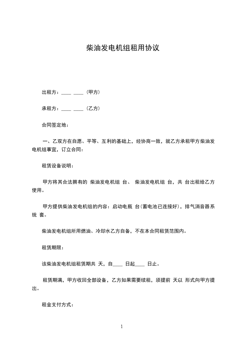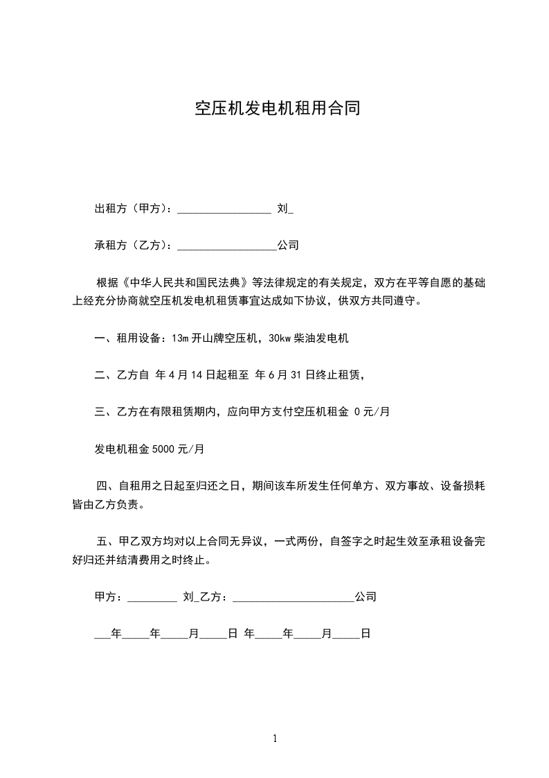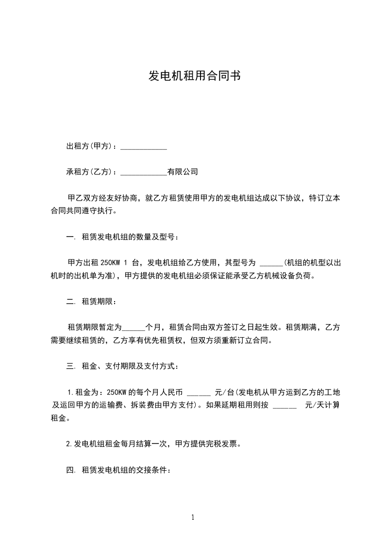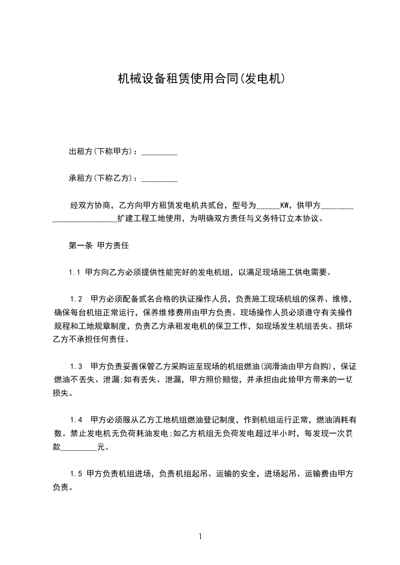 2.甲方发电机擅自中途撤退,乙方将不再支付甲方任何费用;发电机如果要调走,甲方要提前10天通知乙方。