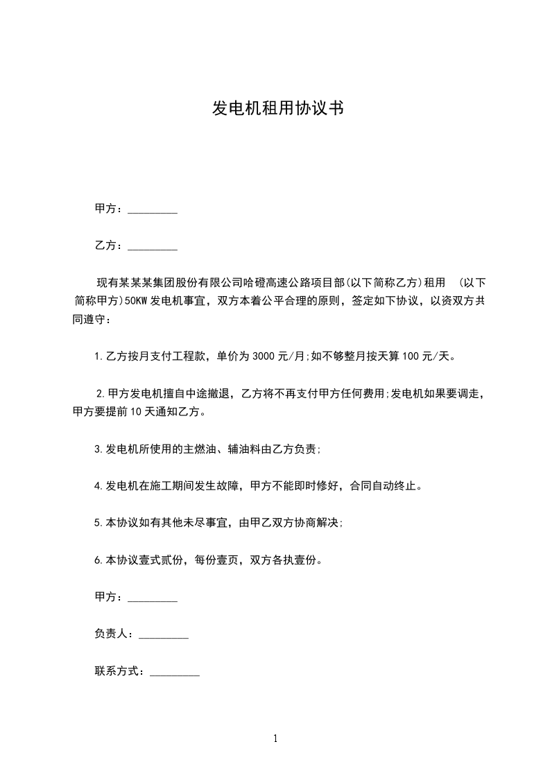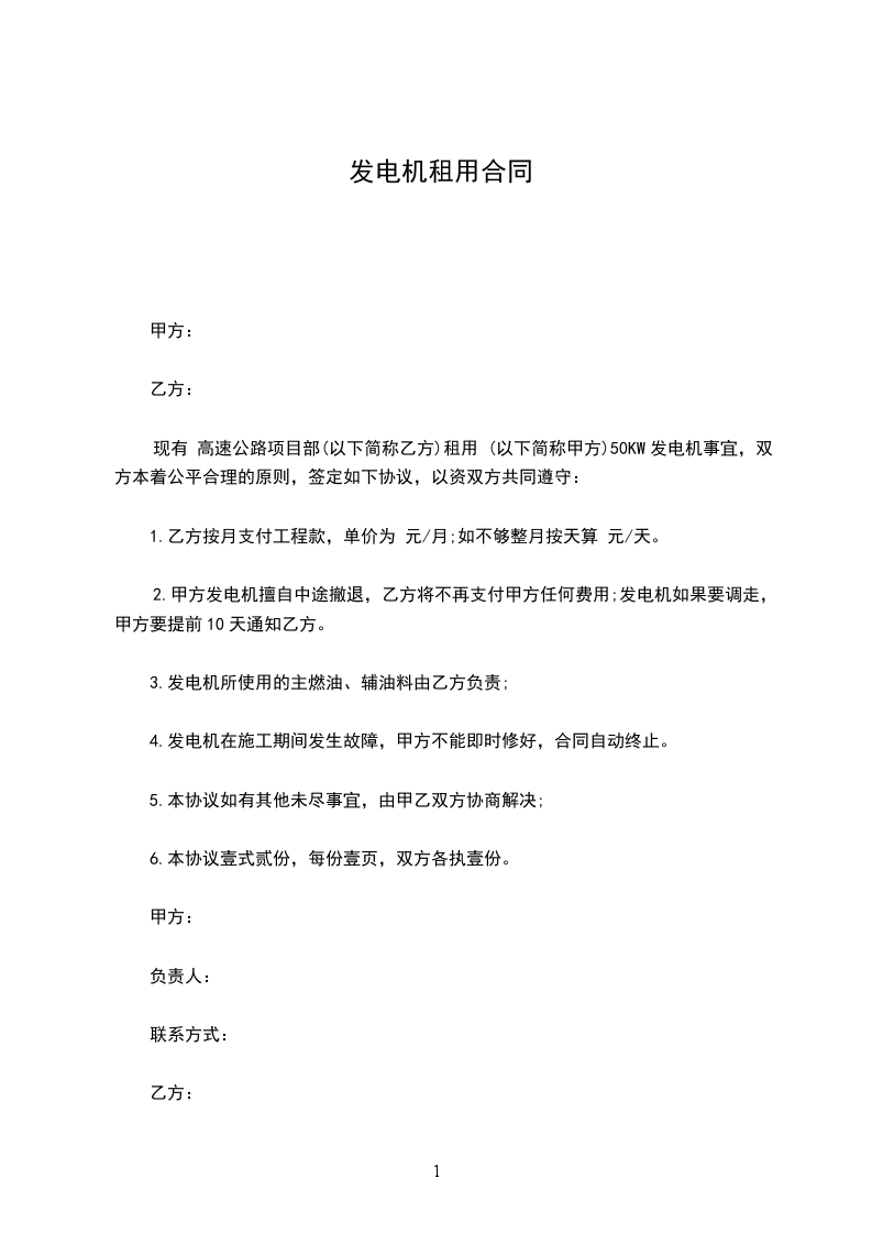 现有 高速公路项目部(以下简称乙方)租用 (以下简称甲方)50KW发电机事宜,双方本着公平合理的原则,签定如下协议,以资双方共同遵守: