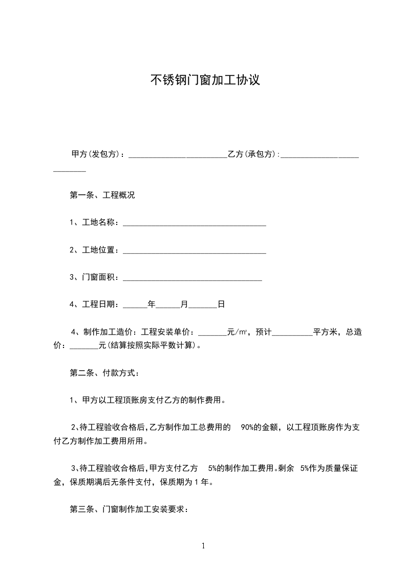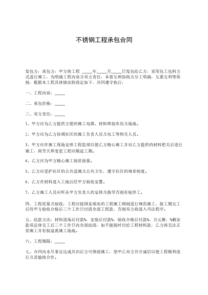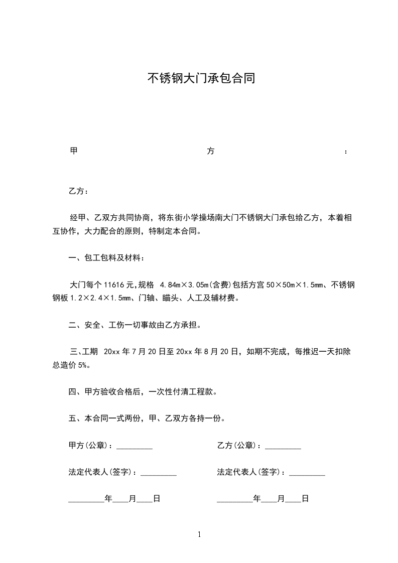 经甲、乙双方共同协商,将东街小学操场南大门不锈钢大门承包给乙方,本着相互协作,大力配合的原则,特制定本合同。