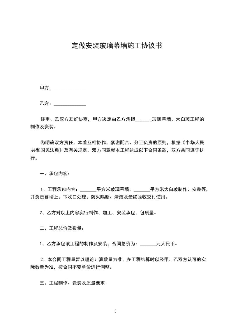 1、工程承包内容:_______平方米玻璃幕墙,_______平方米大白玻制作、安装等,并负责幕墙上、下收口处理、防火隔断、清洁及最终验收交付使用。