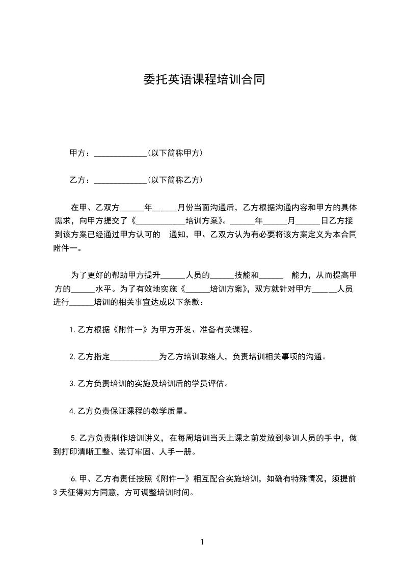 为了更好的帮助甲方提升______人员的______技能和______ 能力,从而提高甲方的______水平。为了有效地实施《______培训方案》,双方就针对甲方______人员进行______培训的相关事宜达成以下条款: