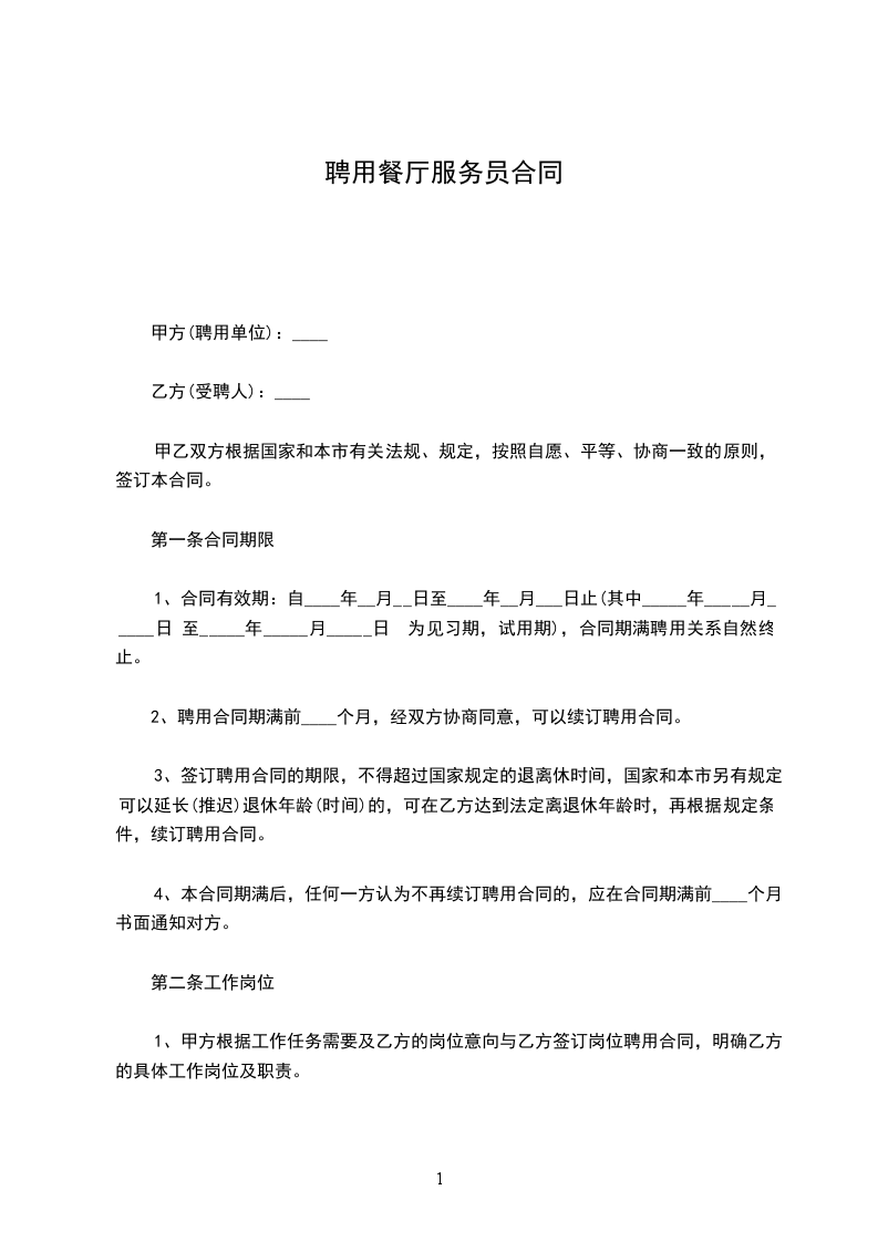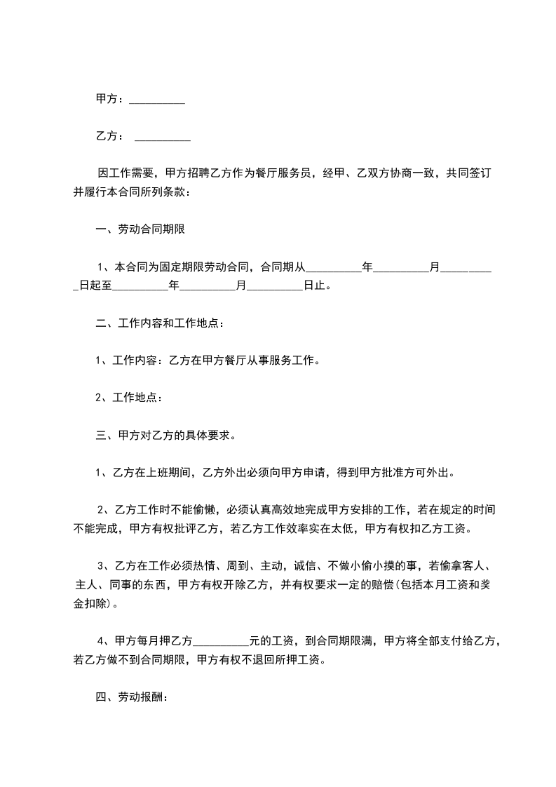 因工作需要,甲方招聘乙方作为餐厅服务员,经甲、乙双方协商一致,共同签订并履行本合同所列条款: