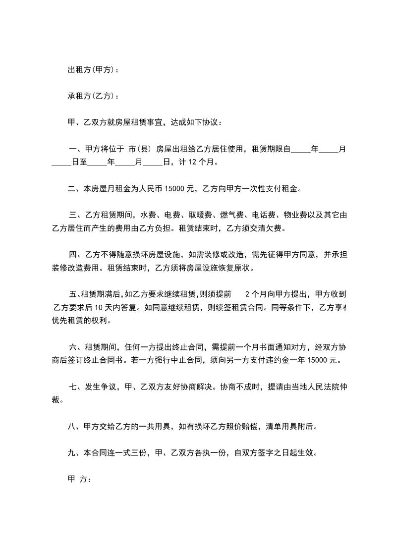 二、本房屋月租金为人民币15000元,乙方向甲方一次性支付租金。