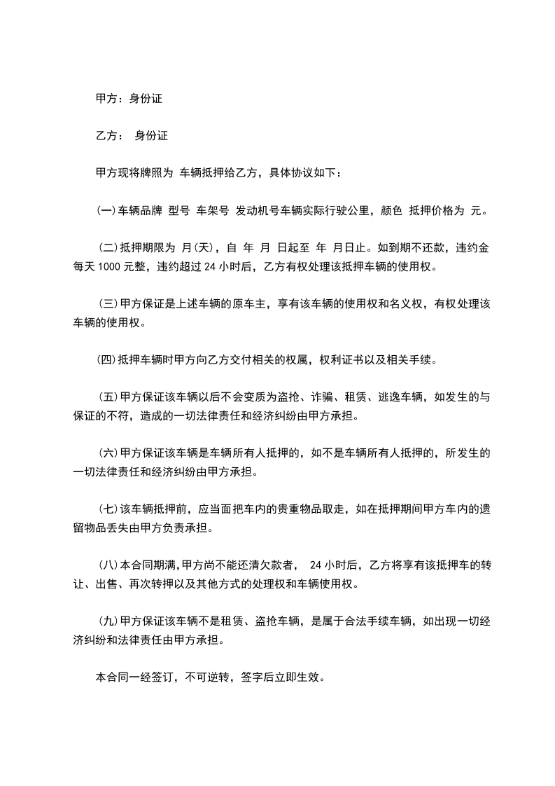 (二)抵押期限为 月(天),自 年 月 日起至 年 月日止。如到期不还款,违约金每天1000元整,违约超过24小时后,乙方有权处理该抵押车辆的使用权。