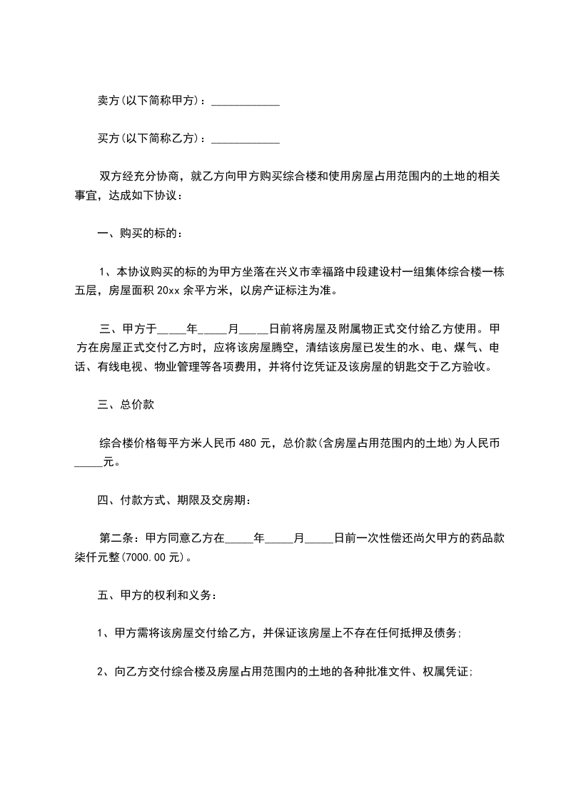 1、本协议购买的标的为甲方坐落在兴义市幸福路中段建设村一组集体综合楼一栋五层,房屋面积20xx余平方米,以房产证标注为准。