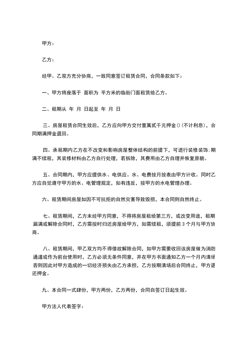 八、租赁期间,甲乙双方均不得借故解除合同,如甲方需要收回该房屋做为消防通道或作为前台使用时,乙方必须无条件同意,并在甲方书面通知乙方一个月内清场否则因此对甲方造成的一切经济损失由乙方承担,乙方按期清场后合同终止,甲方退还押金。