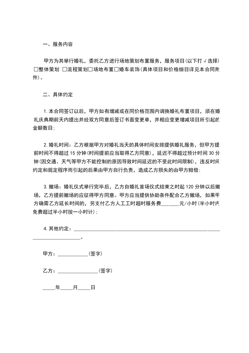 甲方为其举行婚礼,委托乙方进行场地策划布置服务,服务项目(以下打√选择)□整体策划 □流程策划□场地布置□婚车装饰(具体项目和价格细目详见本合同附件)。