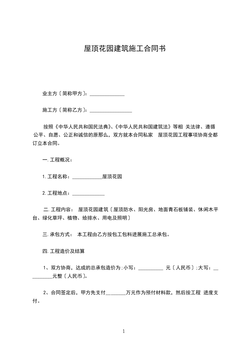 按照《中华人民共和国民法典》、《中华人民共和国建筑法》等相 关法律、遵循公平、自愿、公正和诚信的原那么,双方就本合同私家 屋顶花园工程事项协商全都,订立本合同。