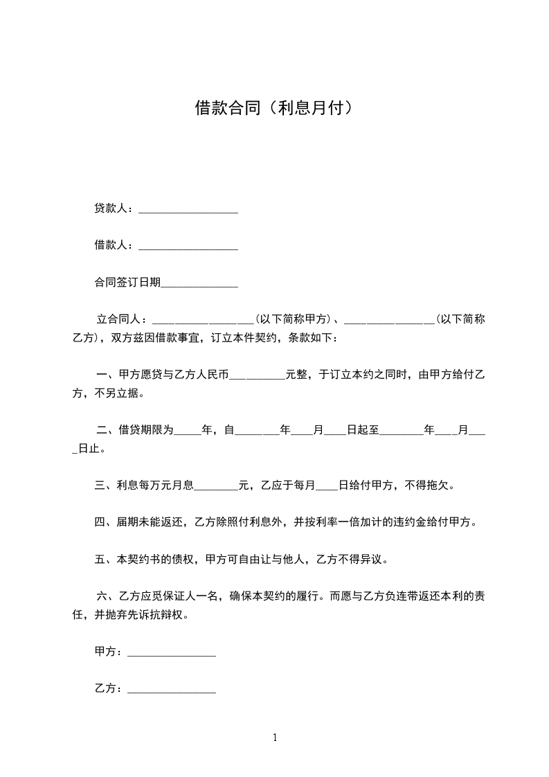 三、利息每万元月息________元,乙应于每月____日给付甲方,不得拖欠。