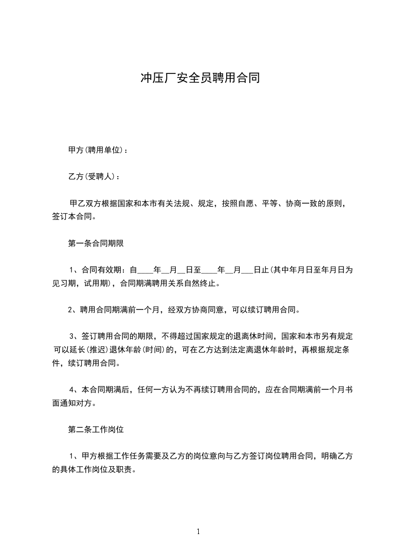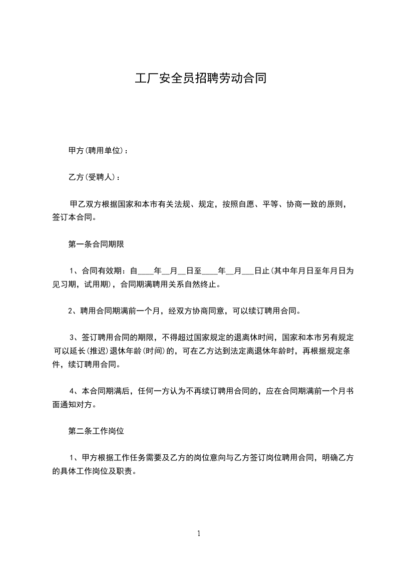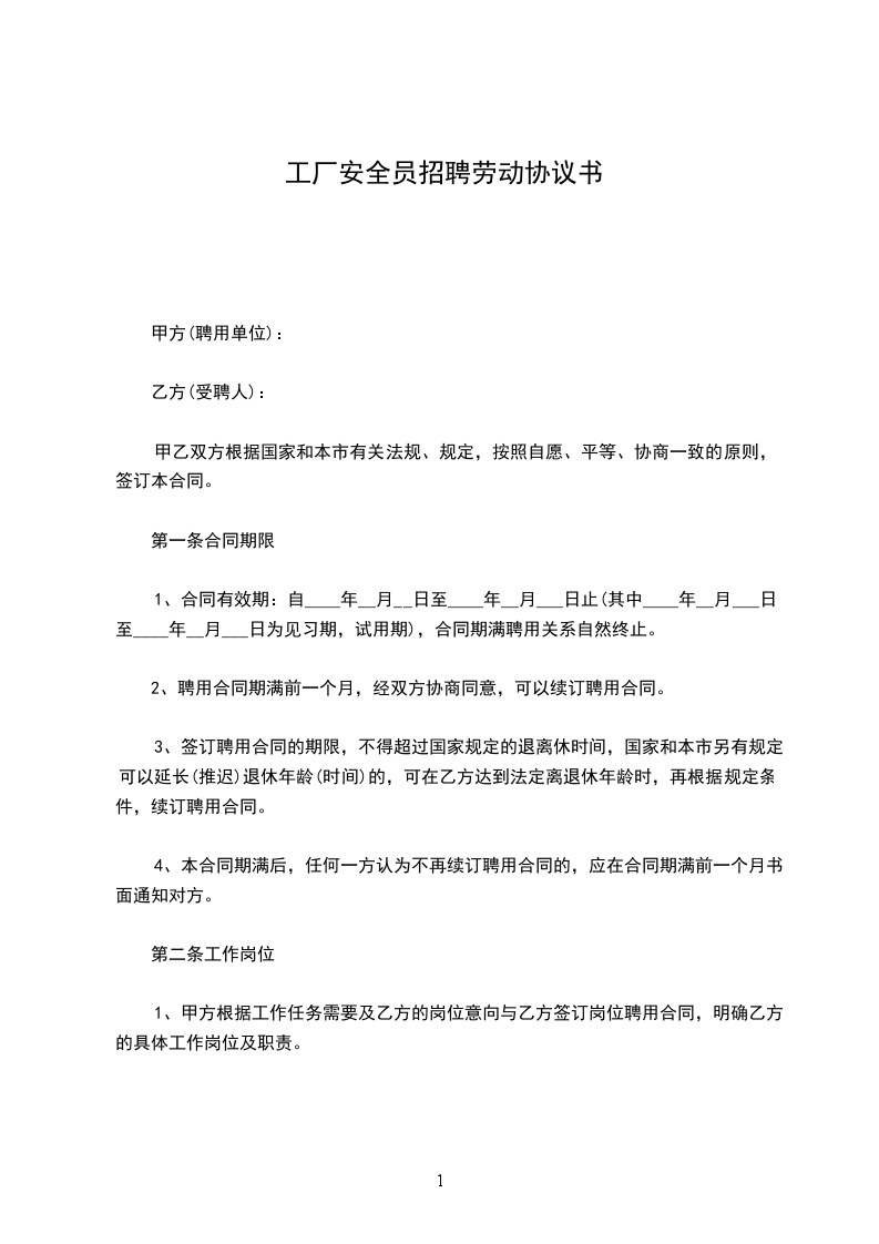 工厂安全员聘用劳动合同