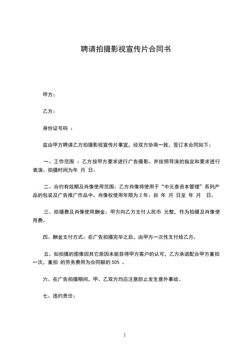 兹由甲方聘请乙方拍摄影视宣传片事宜,经双方协商一致,签订本合同如下: