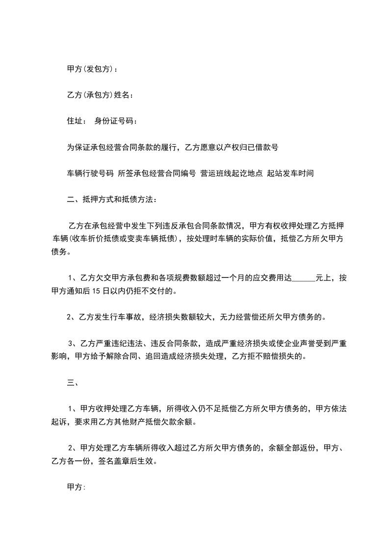乙方在承包经营中发生下列违反承包合同条款情况,甲方有权收押处理乙方抵押车辆(收车折价抵债或变卖车辆抵债),按处理时车辆的实际价值,抵偿乙方所欠甲方债务。