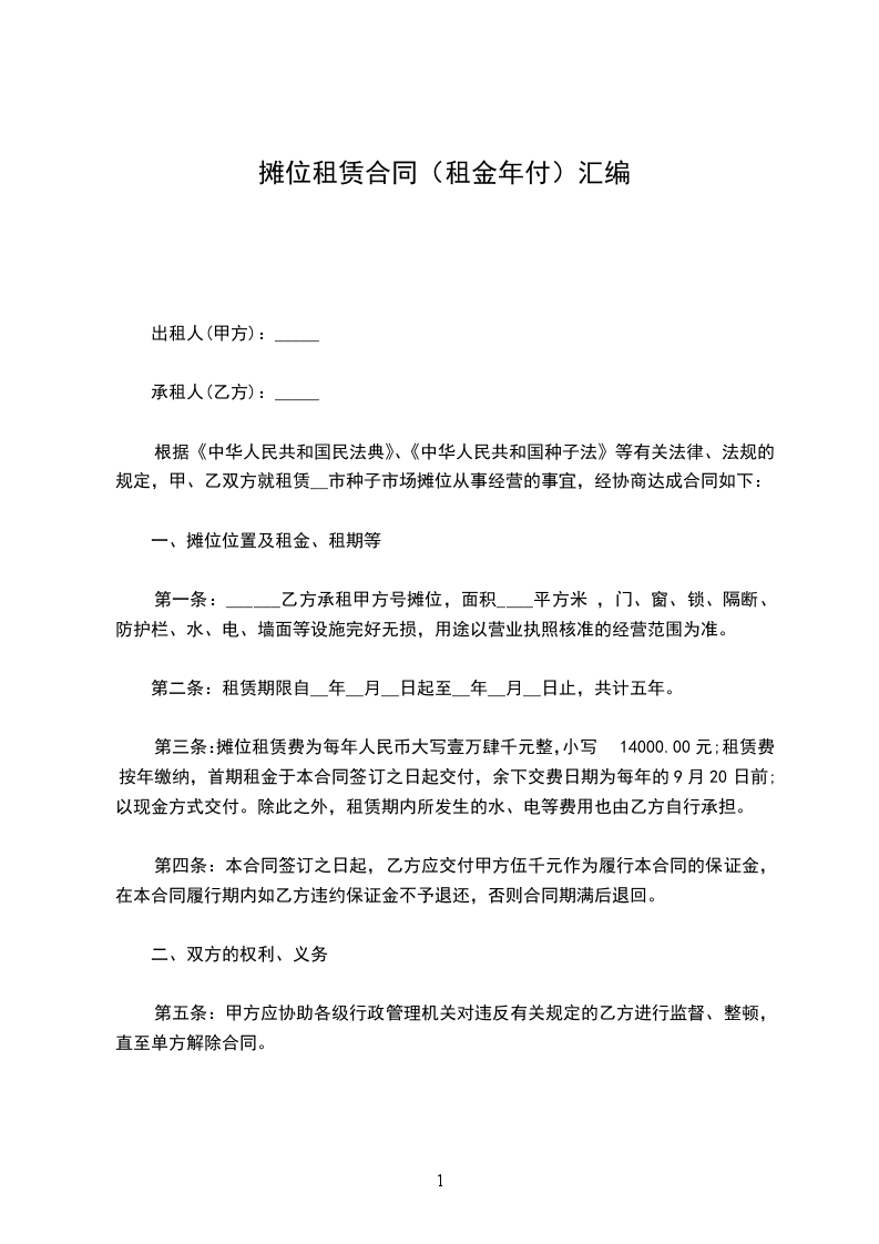 第一条 乙方租用出租房屋的期限自 年 月 日至 年 月 日止,租期 年。出租房屋的租金为 元/年,租金每半年支付一次,半年租金 元,承租前由乙方一次性支付,租金支付采用现金支付方式。