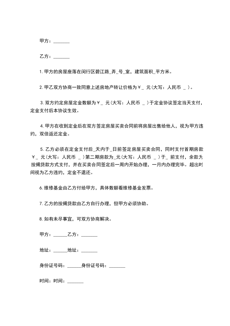 3.双方约定房屋定金数额为¥ 元正(大写:人民币_____元正)于定金协议签定当天支付,定金支付后本协议生效。