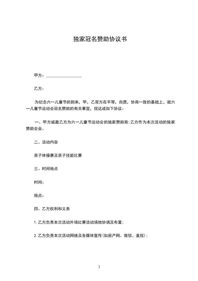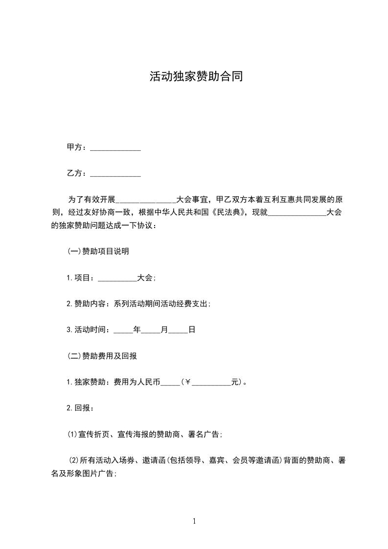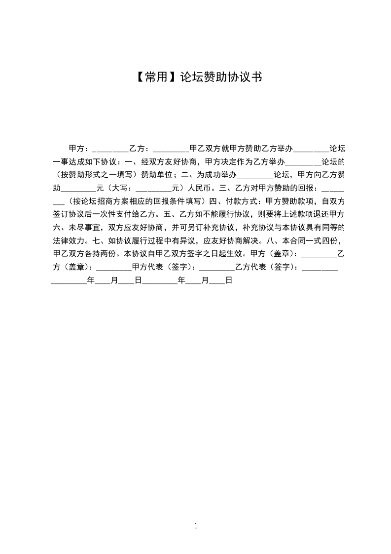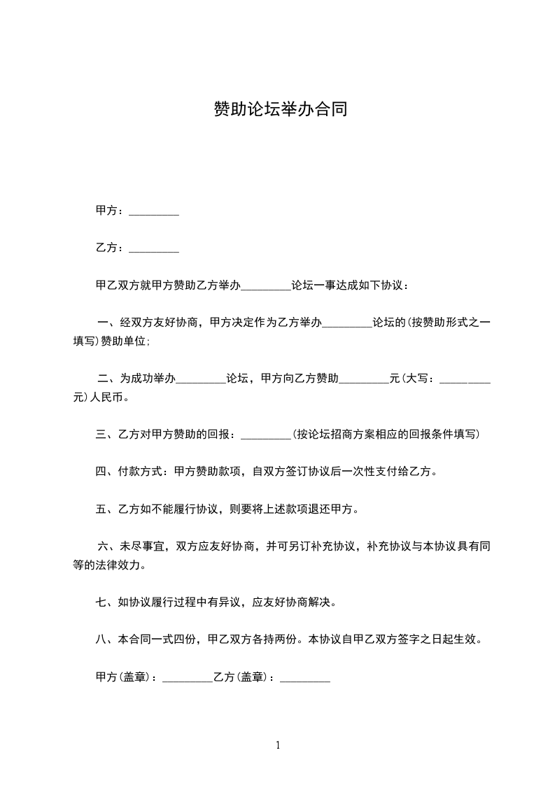 一、经双方友好协商,甲方决定作为乙方举办_________论坛的(按赞助形式之一填写)赞助单位;