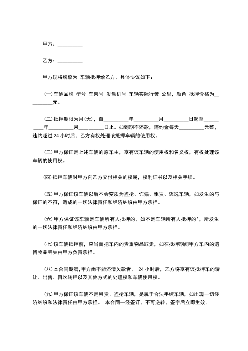 (二)抵押期限为月(天),自__________年__________月__________日起至__________年__________月__________日止。如到期不还款,违约金每天__________元整,违约超过24小时后,乙方有权处理该抵押车辆的使用权。
