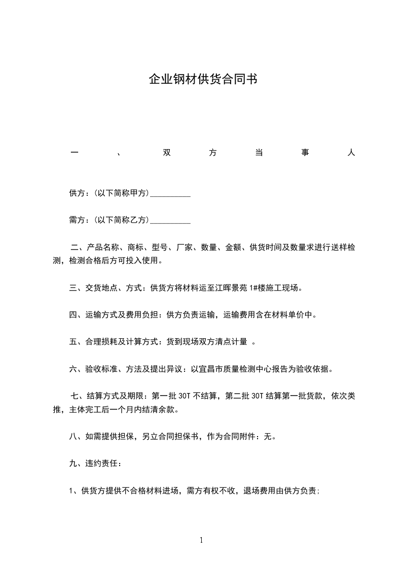 七、结算方式及期限:第一批30T不结算,第二批30T结算第一批货款,依次类推,主体完工后一个月内结清余款。