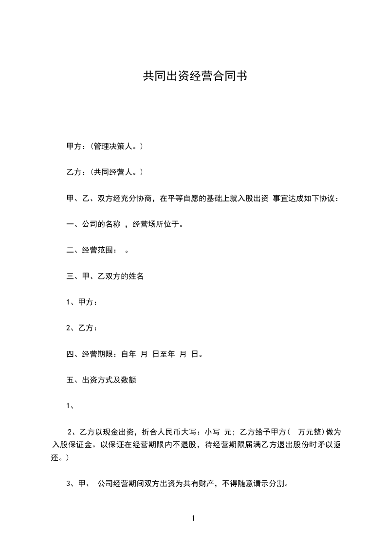 3、甲、乙双方出资共计人民币_____元。 公司经营期间双方出资为共有财产,不得随意请示分割。