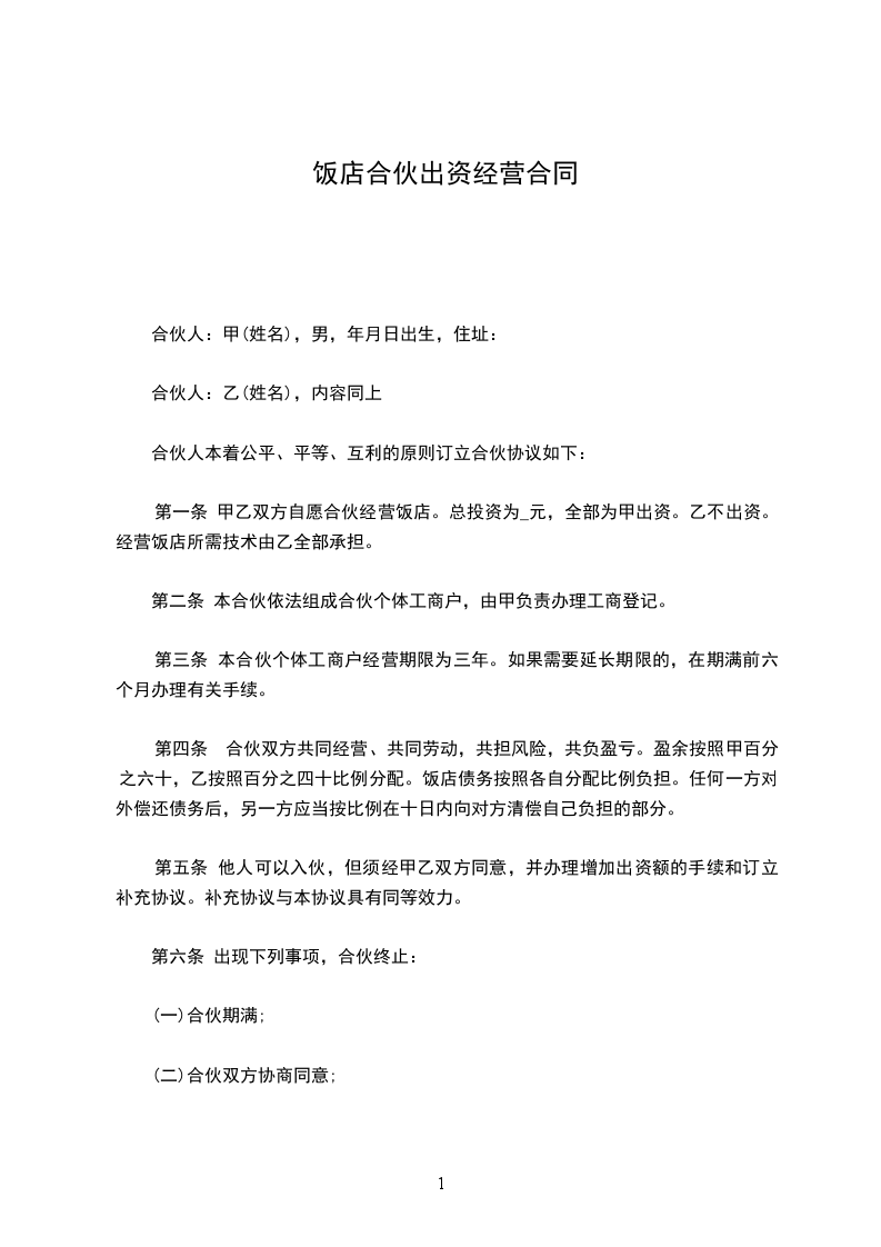 5、经营终止后,甲,乙双方的出资仍为个人所有, 届时予以返还。
