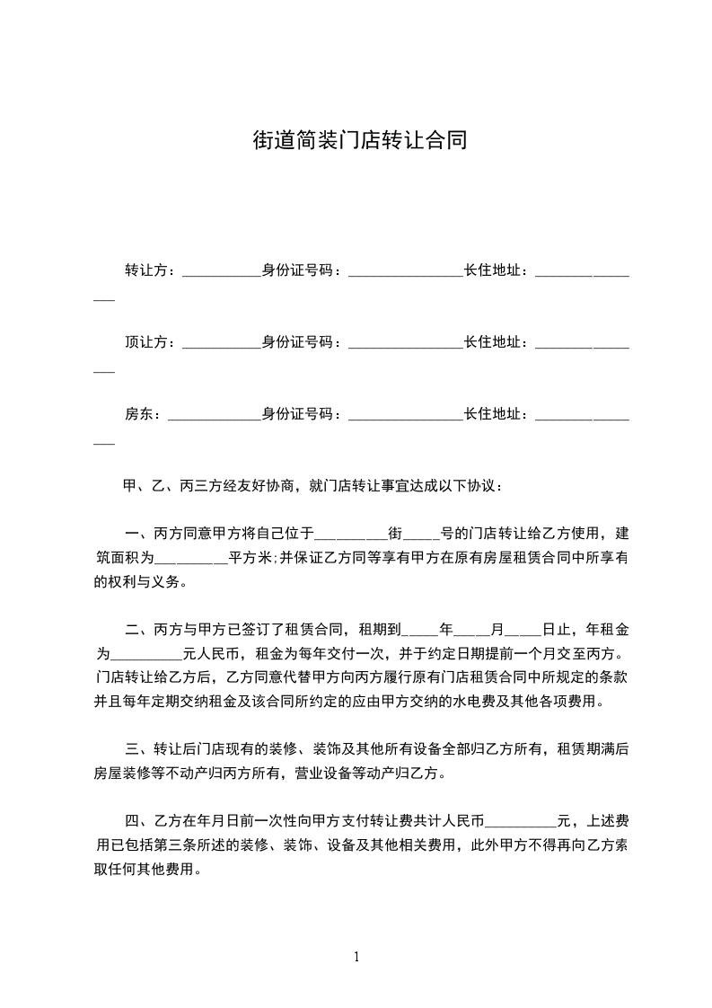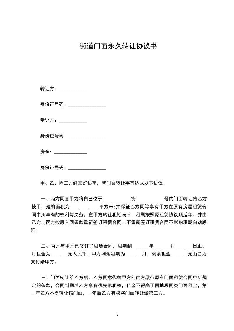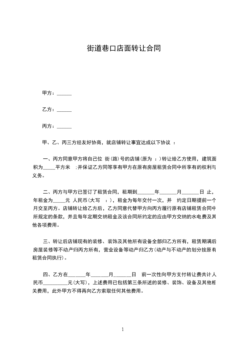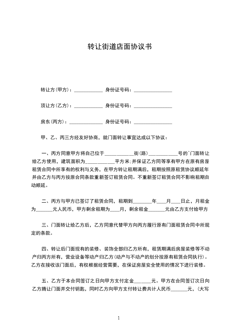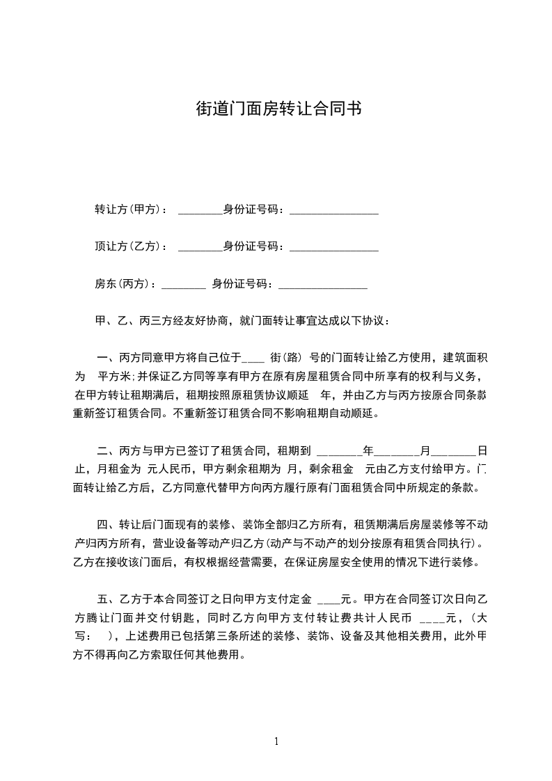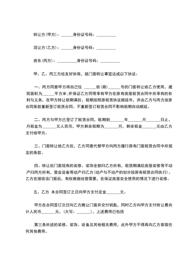 一、丙方同意甲方将自己位于____________街(路)____________号的门面转让给乙方使用,建筑面积为 ____________平方米;并保证乙方同等享有甲方在原有房屋租赁合同 中所享有的权利与义务,在甲方转让租期满后,租期按照原租赁合同顺延 年,并由乙方与丙方按原合同条款重新签订租赁合同。不重新签订租赁合同不影响租期自动顺延。