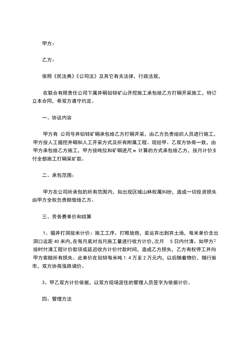 在联合有限责任公司下属井硐铅锌矿山开挖施工承包给乙方打硐开采施工,特订立本合同,希双方遵守约定。