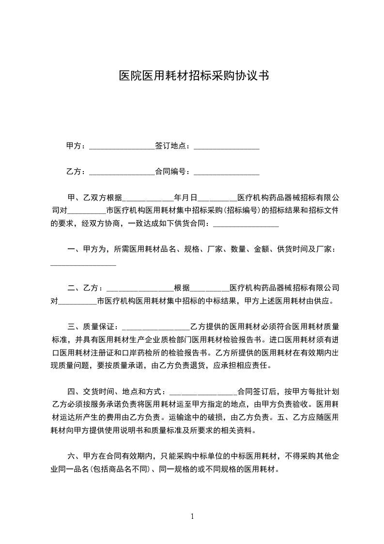 甲、乙双方根据__________________年_____月_____日__________医疗机构药品器械招标有限公司对__________市医疗机构医用耗材集中招标采购(招标编号)的招标结果和招标文件的要求,经双方协商,一致达成如下供货合同:_________________
