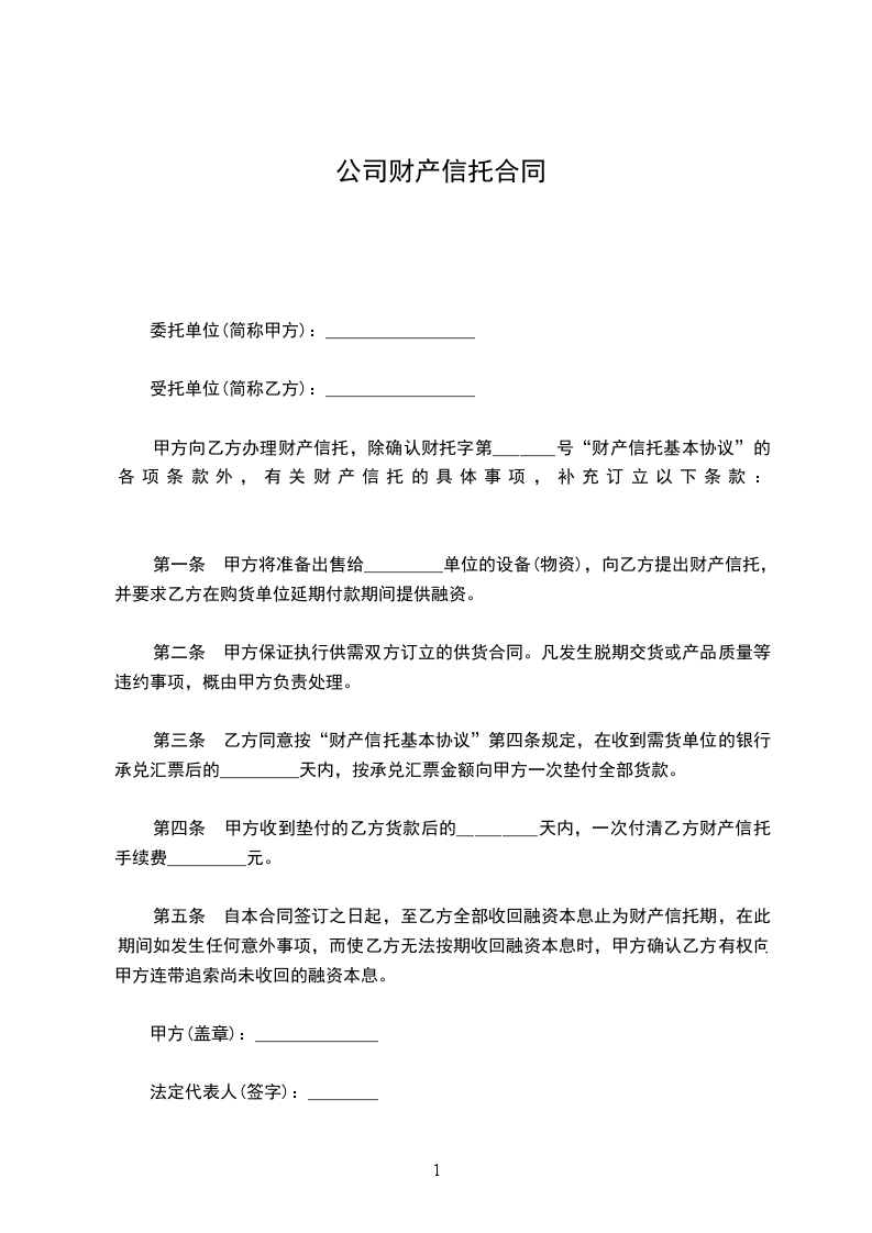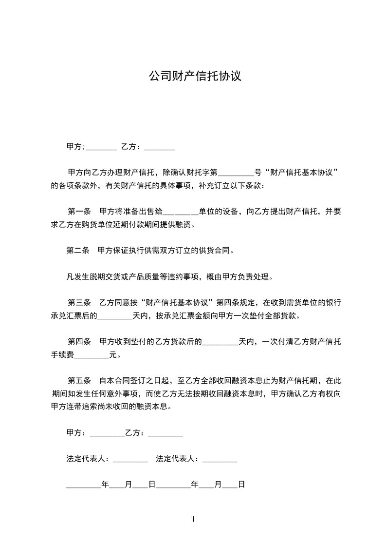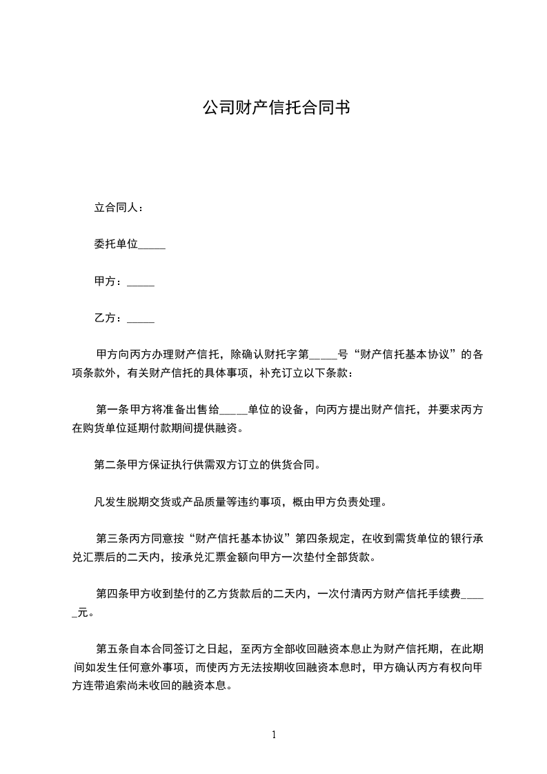 第一条 甲方将准备出售给_________单位的设备(物资),向乙方提出财产信托,并要求乙方在购货单位延期付款期间提供融资。