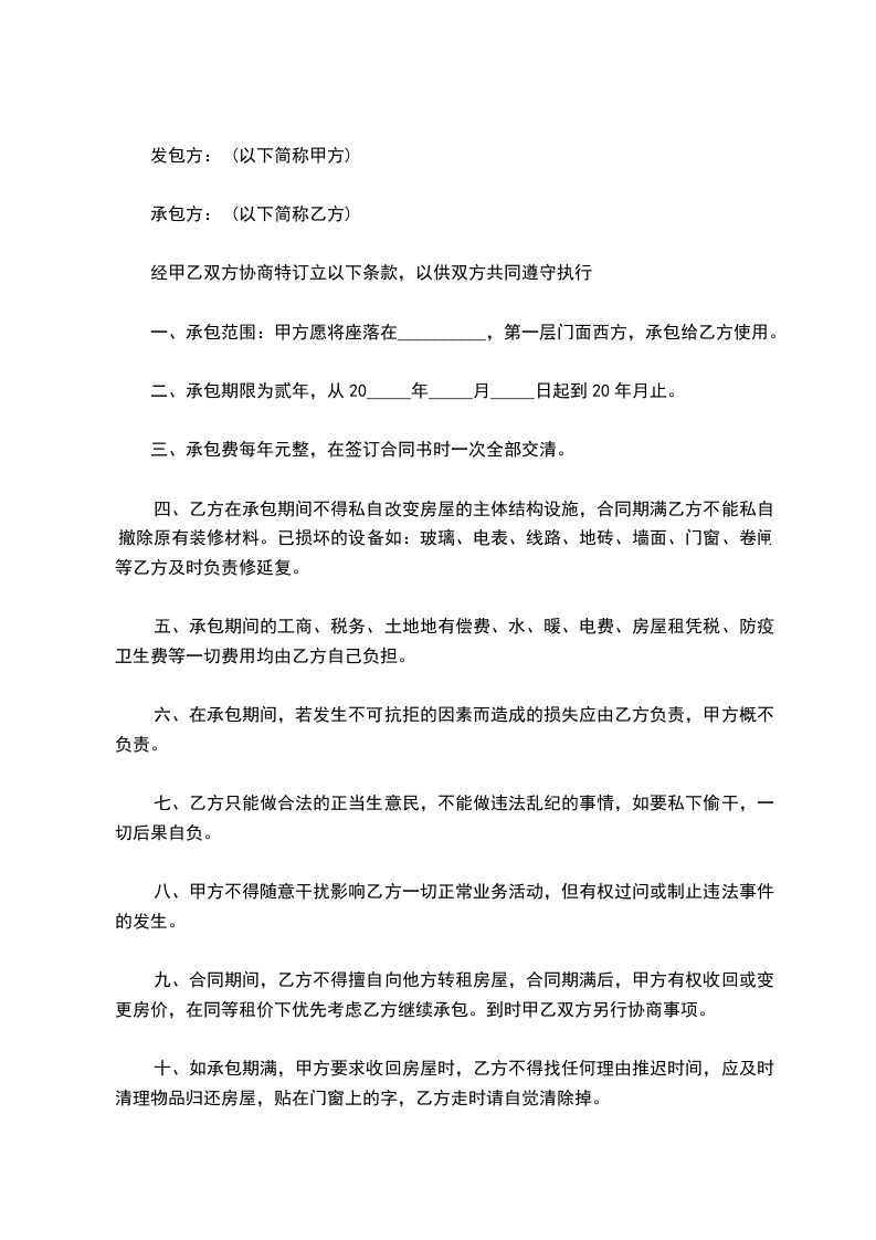 一、承包范围:甲方愿将座落在__________,第一层门面西方,承包给乙方使用。
