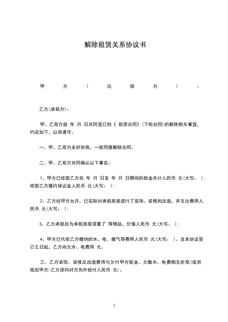 一、甲、乙双方友好协商,一致同意解除合同。